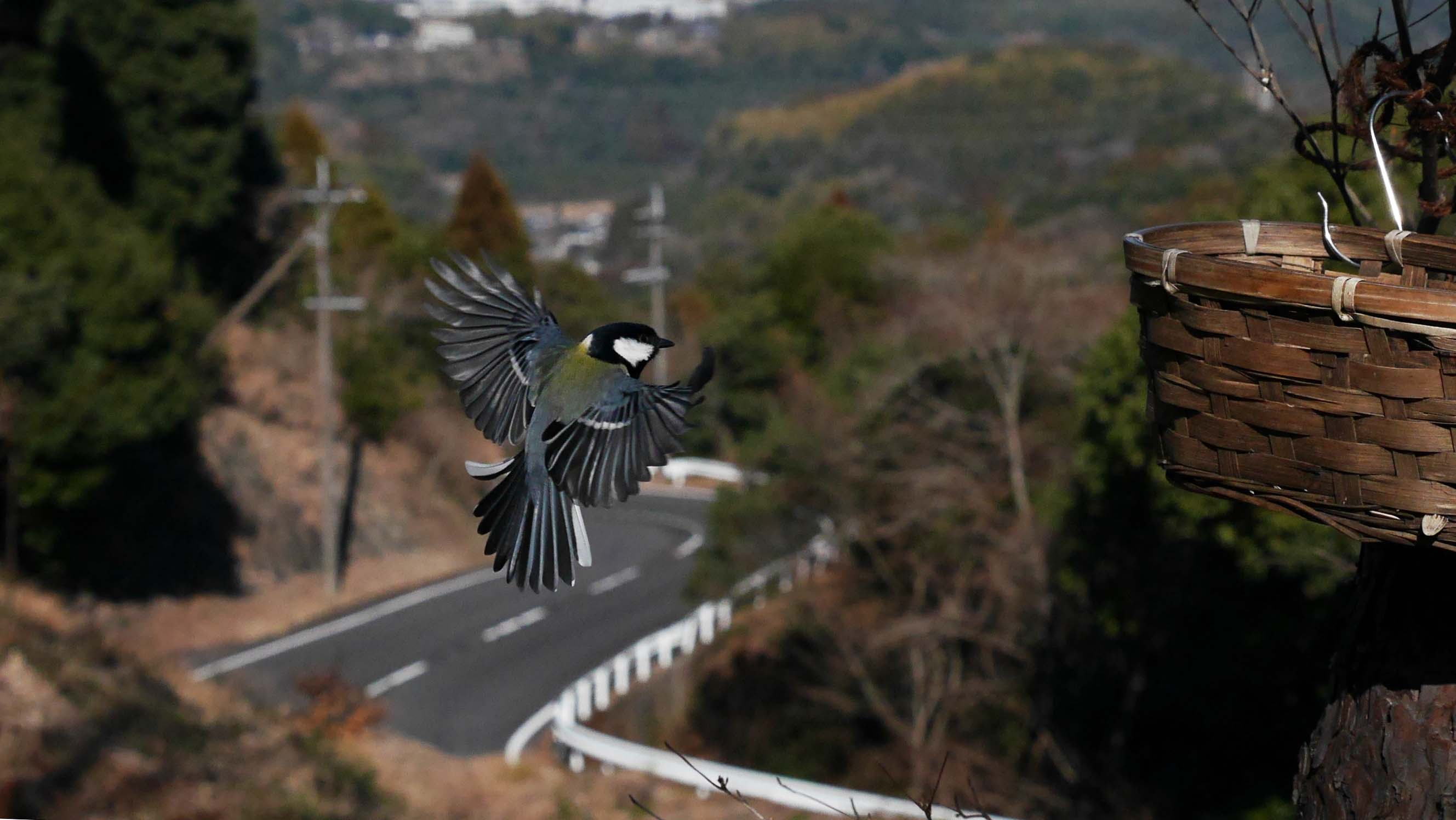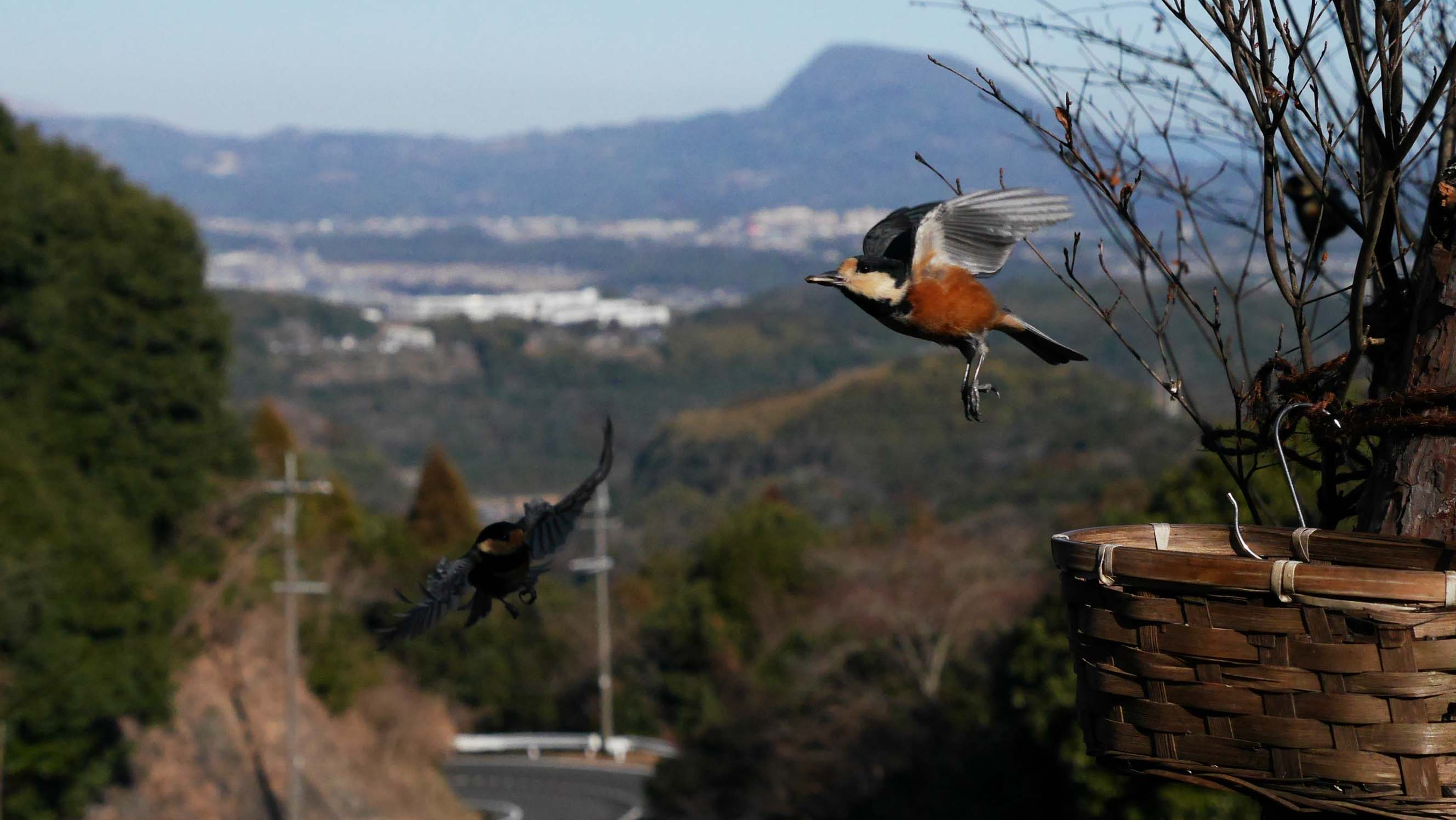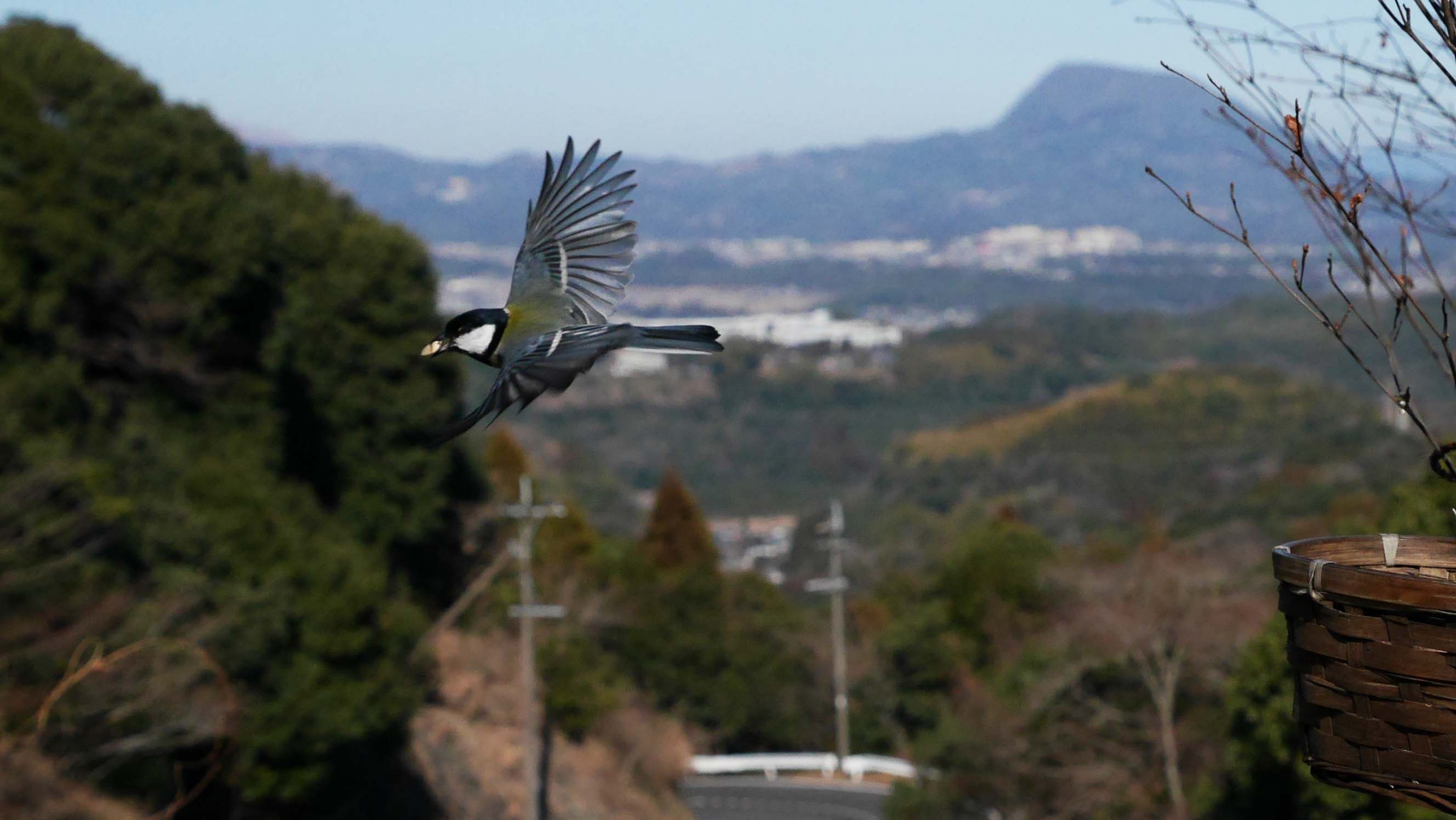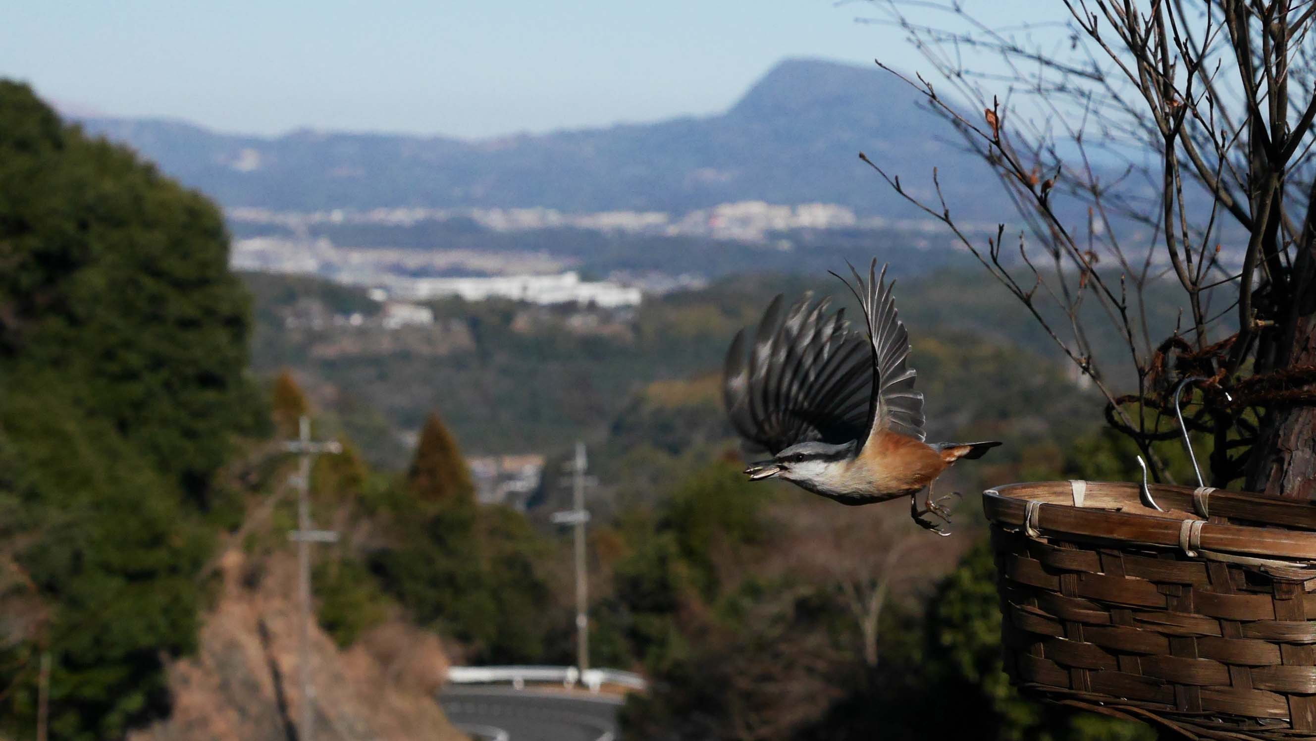 高崎山をバックに飛び去り