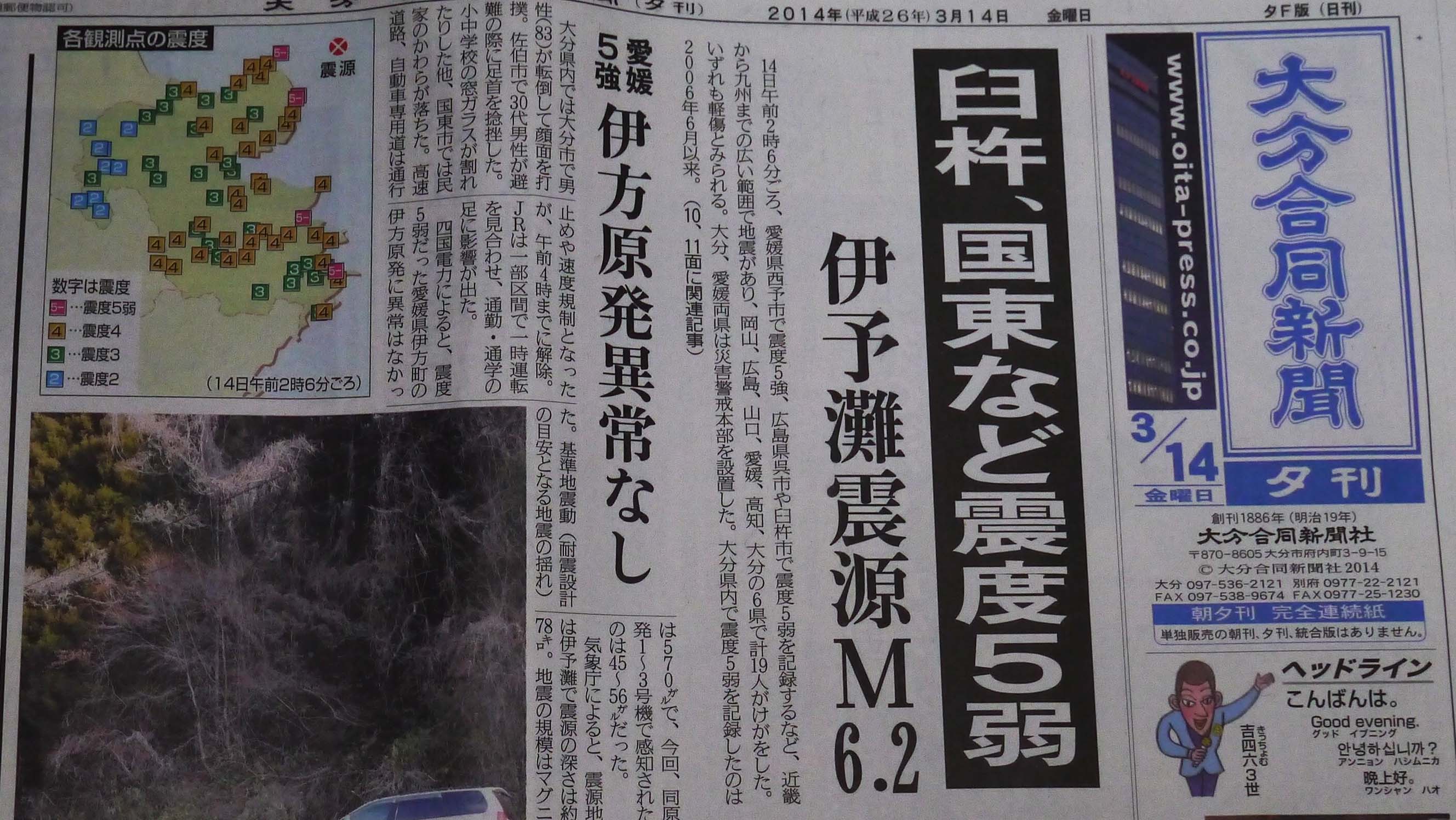 今日の大分合同新聞の夕刊は、地震の話題で占めていました。