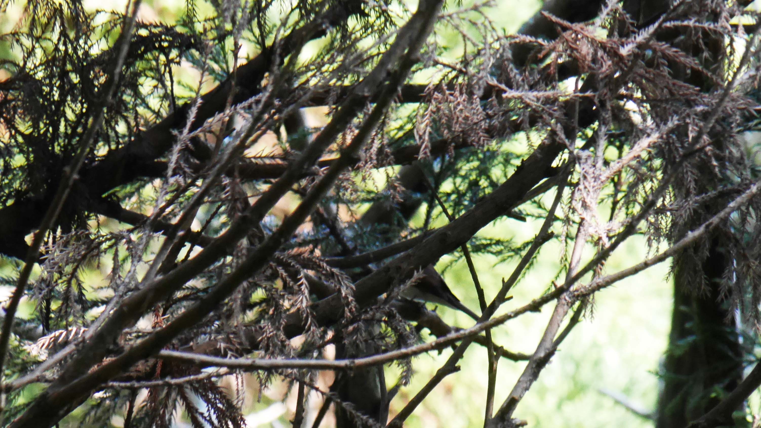 その内オス同士のバトルが始まり、その近くでメスも鳴いています。メスはなかなか姿を捉える事が出来ませんが、やがて一羽のオスは上流側へと去り、その後、残ったオスは木の梢近くを動き回るメスを一定の間隔を置いて追いかけていました。オスは求愛のディスプレイを時々見せていますが、メスの方は無視しているみたいでした。