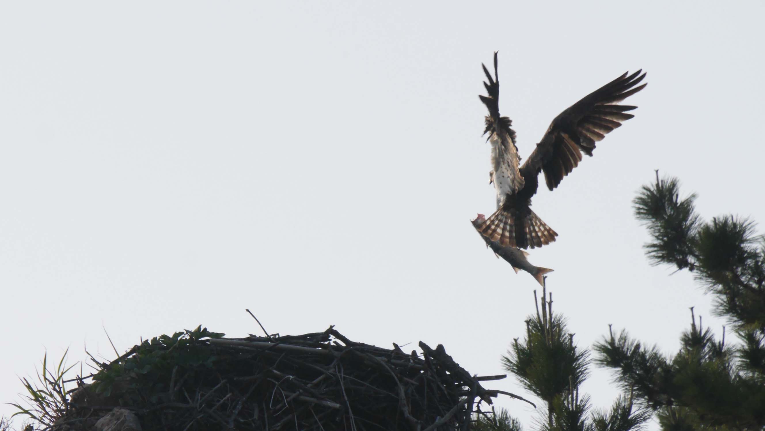 もう一羽が大きなボラを持ち帰りました