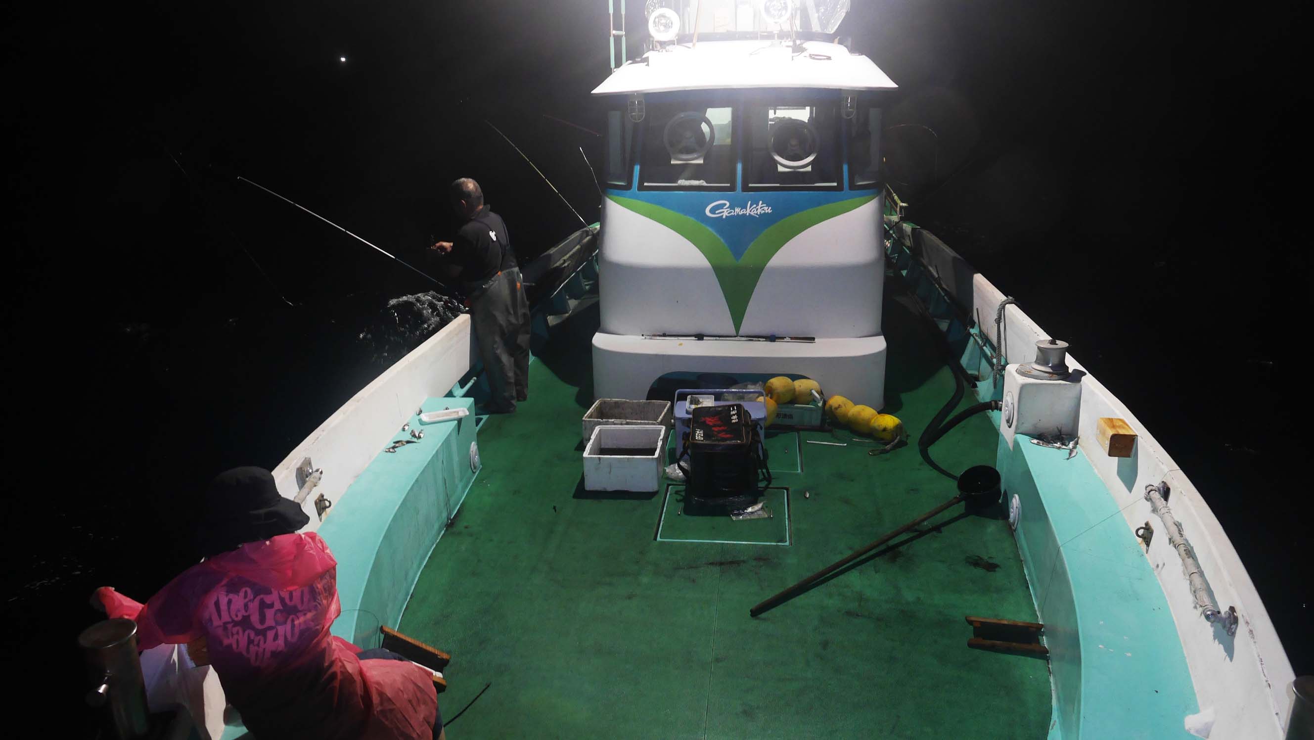 鶴見の渡船、進栄丸での水の子灯台周辺海域で船からのケンサキイカ釣りは、毎年の恒例行事です。17時過ぎに出港~午前1時納竿の工程でしたが、今年は貧果でなおかつ激しい雨の洗礼を受け、ある意味思い出に残った厳しい一夜でした。