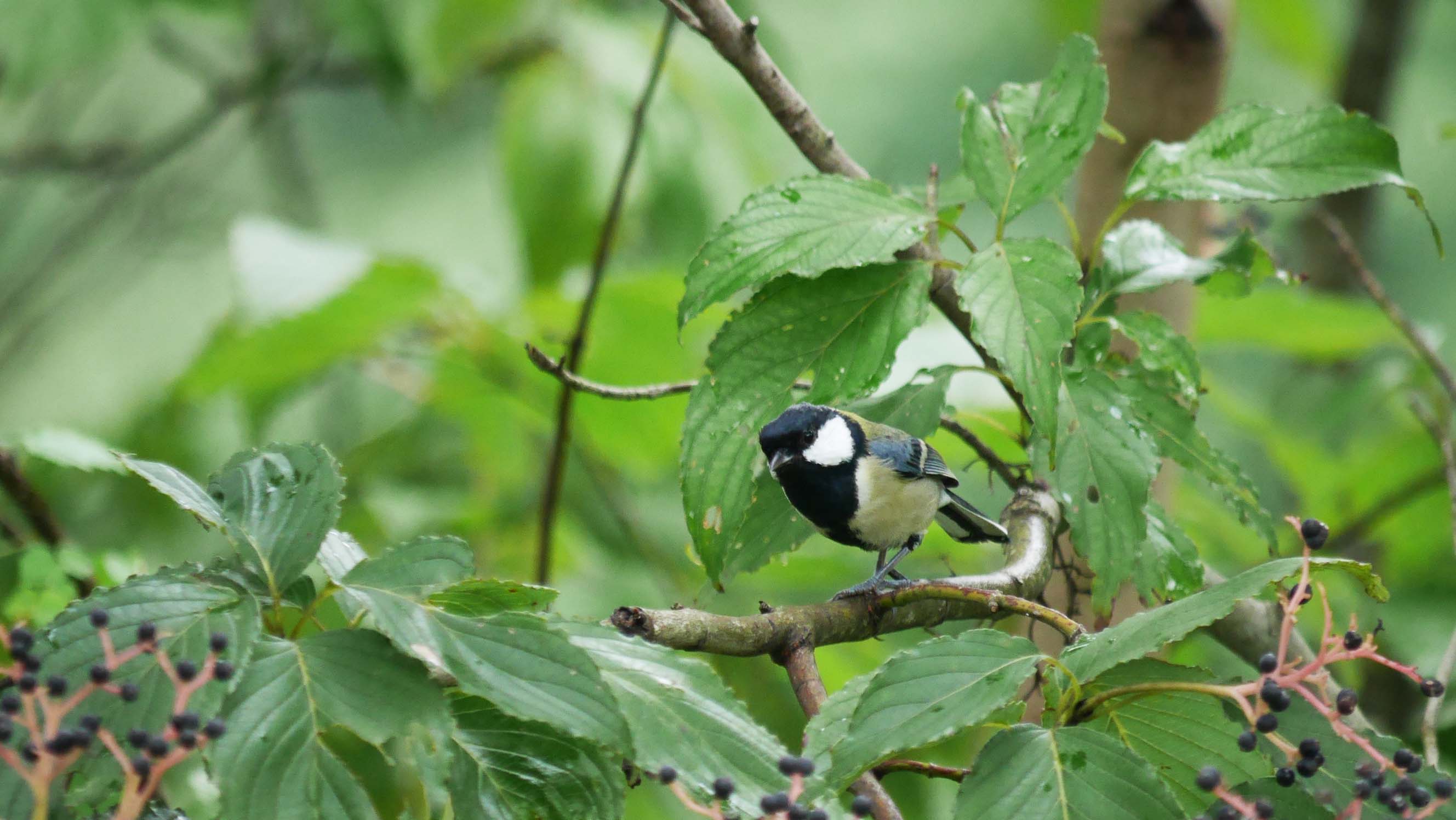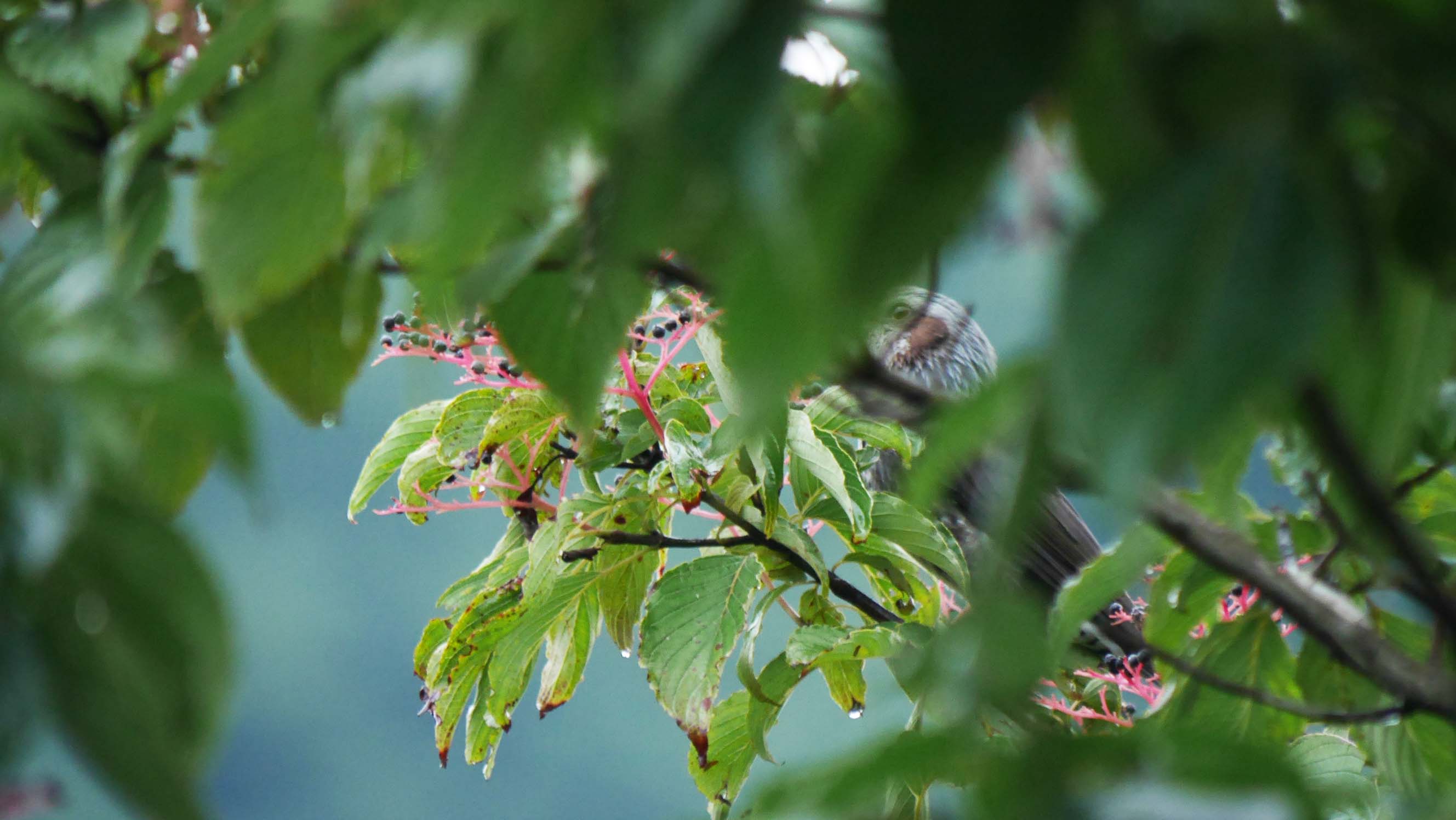 県民の森内の、ヤマガラハウスに一番近いクマノミズキへ小鳥達が出入り。