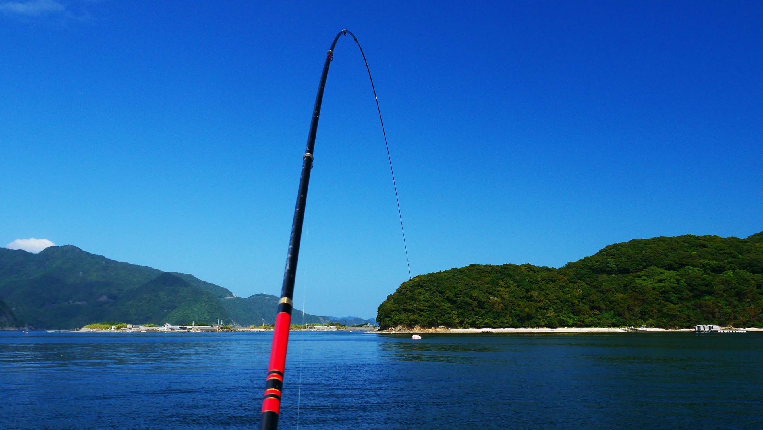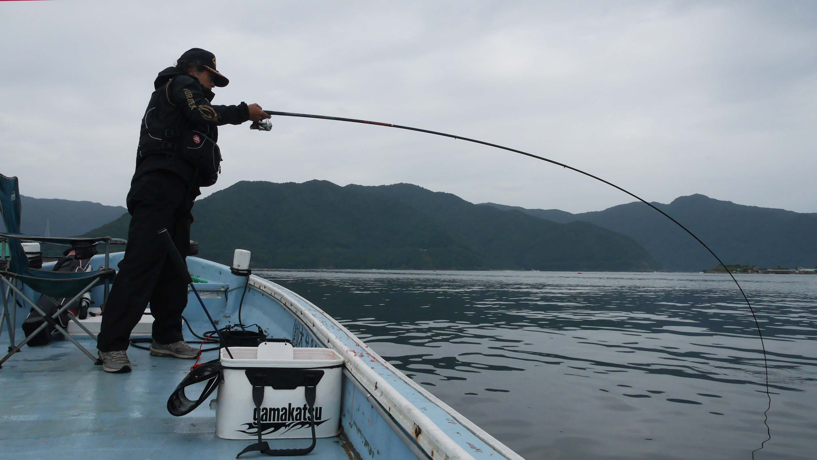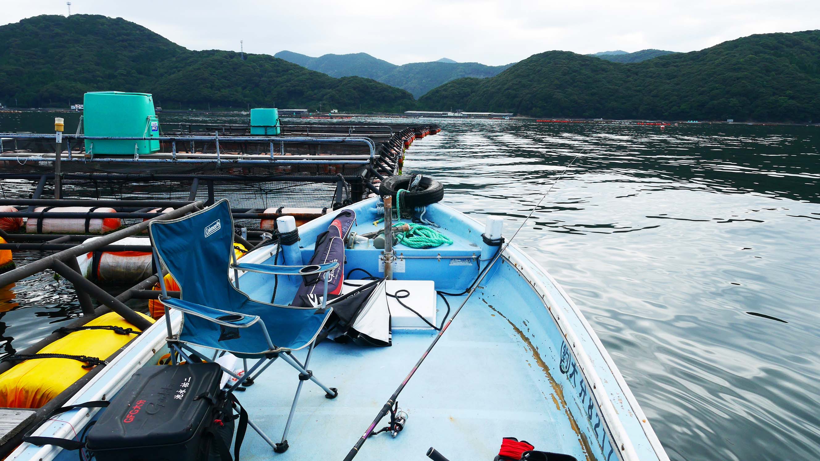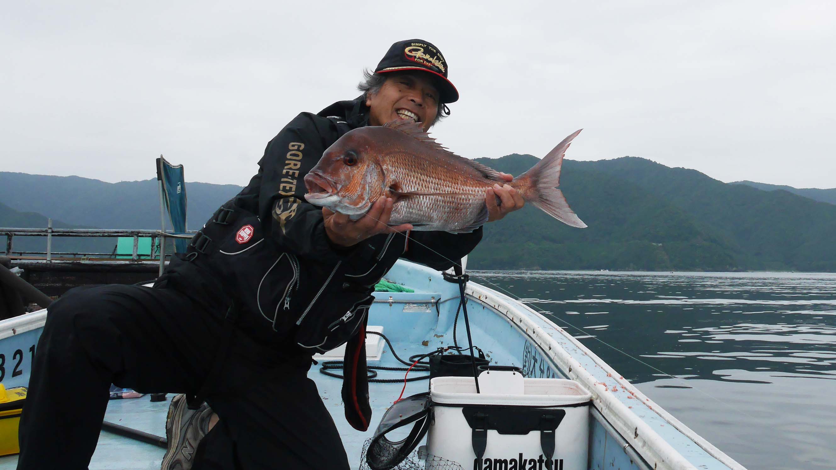 8時過ぎに、伝馬船を借りて自分の運転でイケスに到着。午前中に6枚釣ってストリンガーが無くなり、一度丘へ戻って6枚のマダイを生かしたまま預け、再度イケスへ行って15時まで粘りました。午後からのゴールデンタイムは3枚だけで終了でした。