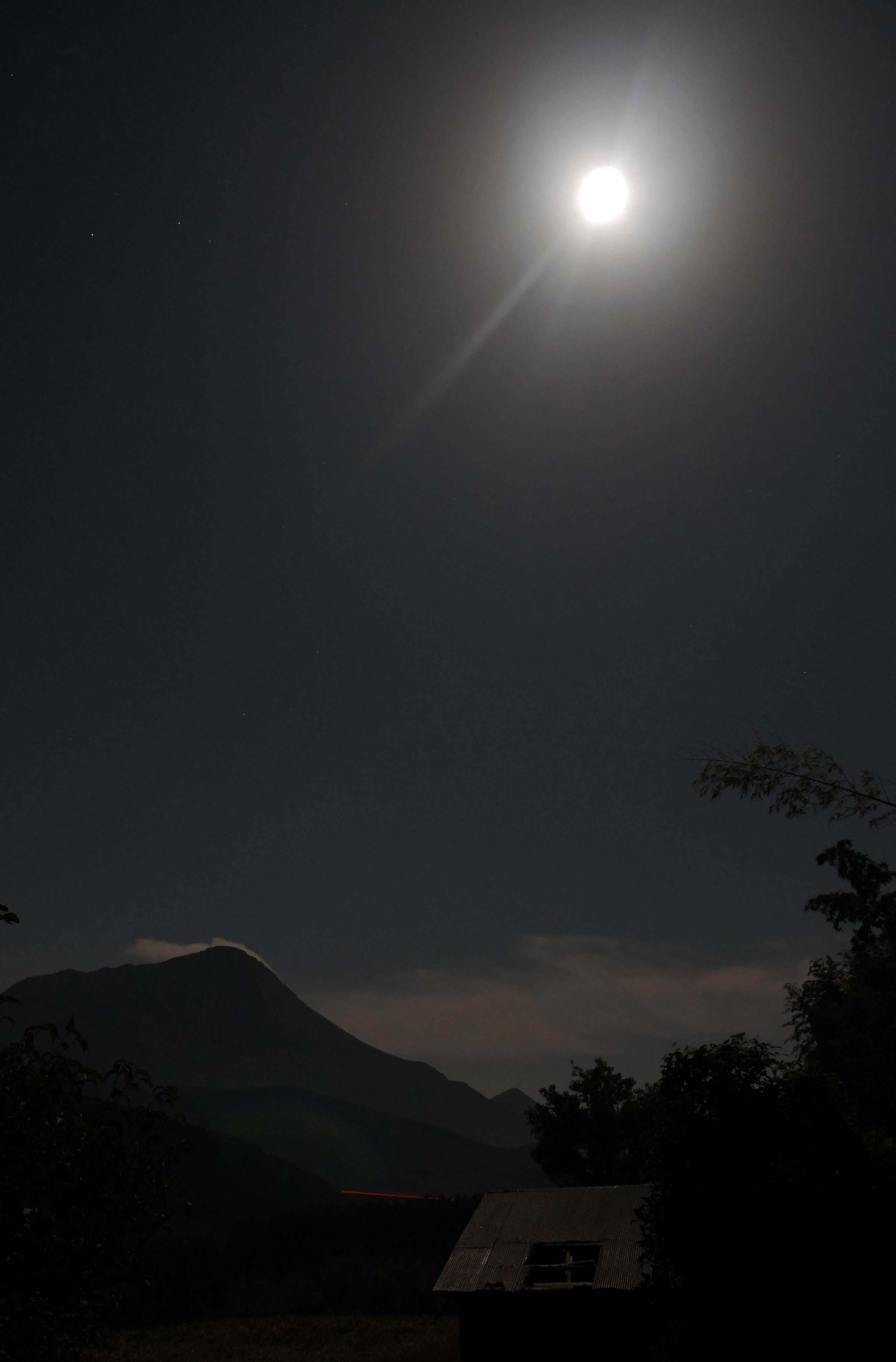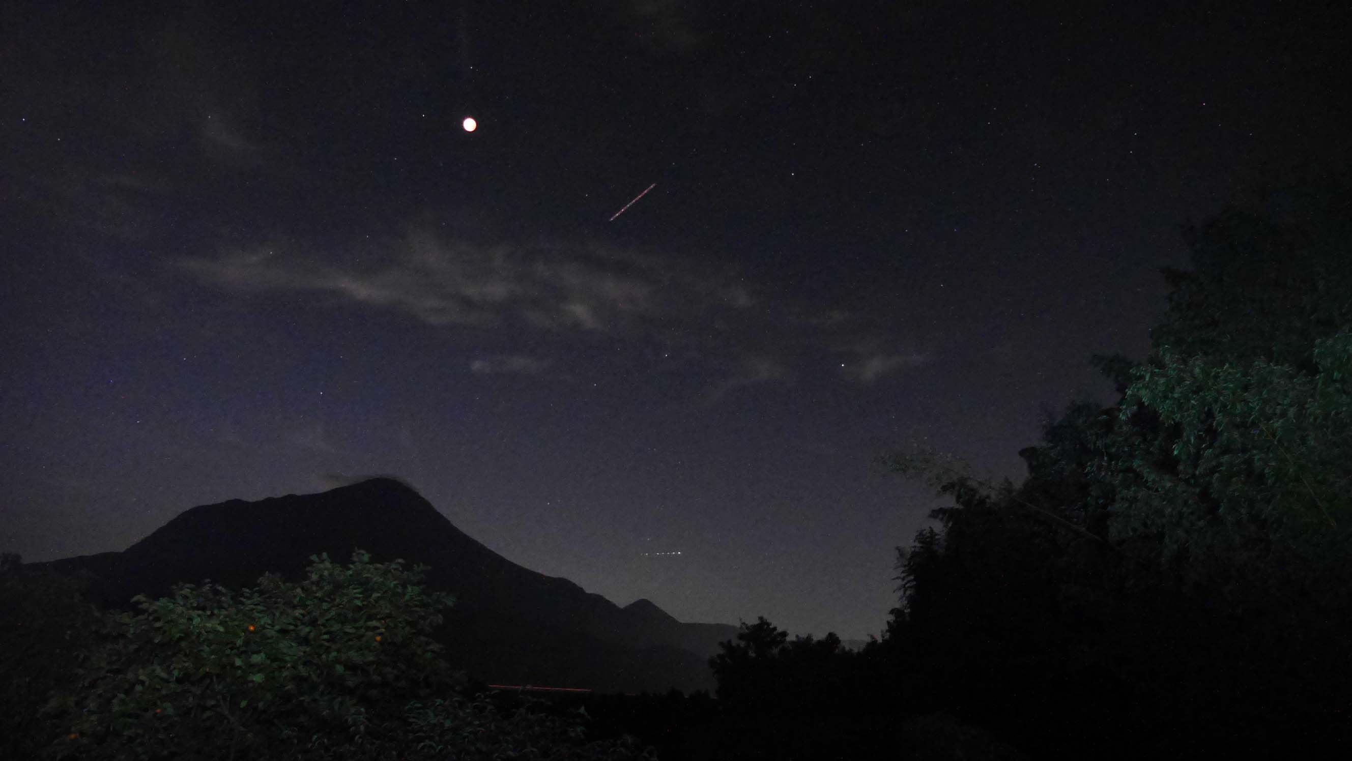 19時47分皆既月食中、星・由布岳・飛行機と
