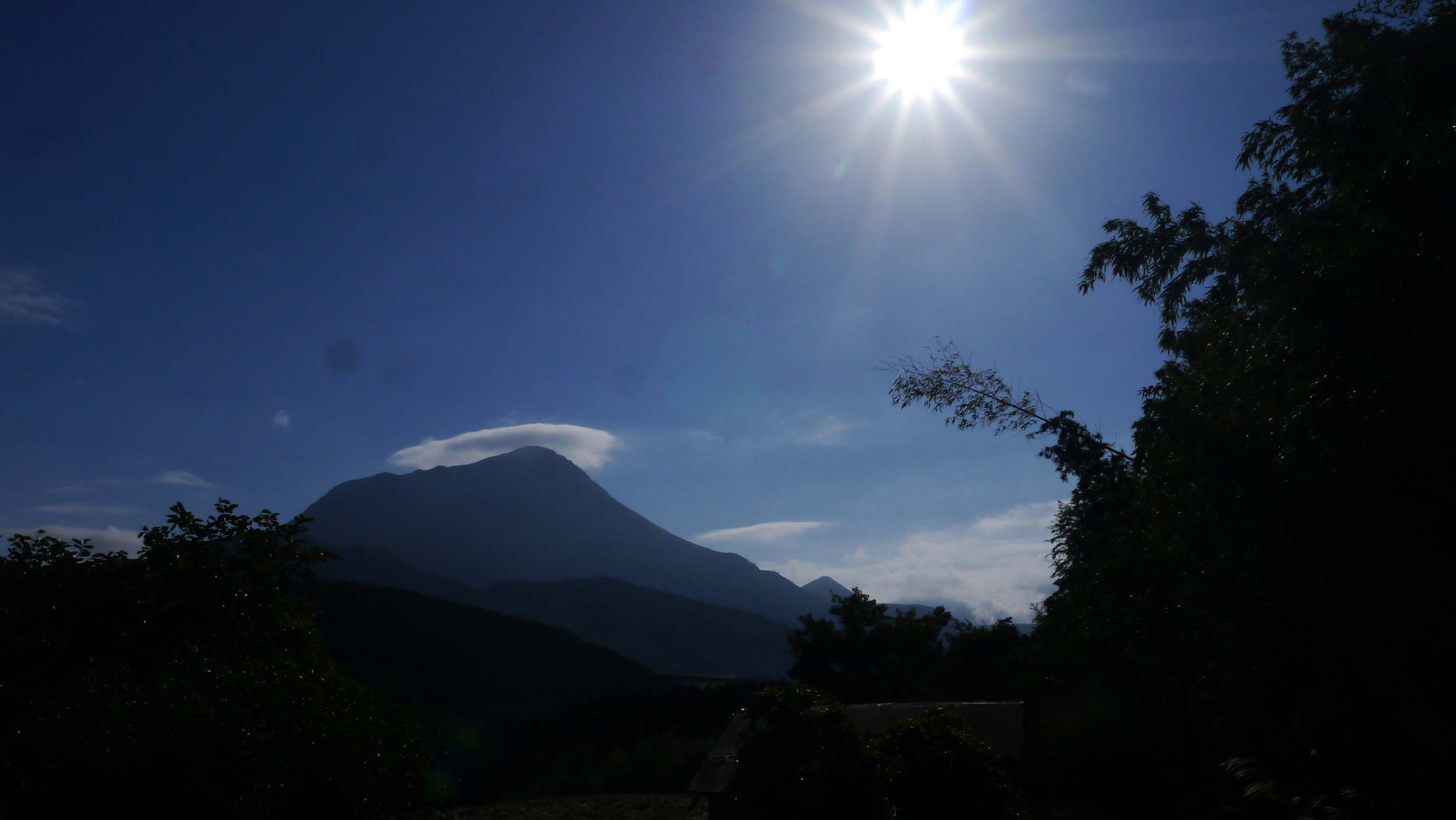 福岡からの帰途での撮影場所は、日田市で行うと皆既月食の始まりから終わりまで撮れる感じです。場所確認の為、朝7時30分頃に自宅を出て由布院を通過する時、由布岳の頂上近くに太陽がありました。今回の皆既月食の時間は約一時間もあることから、月も太陽とほぼ同じ位置に登ると判断し、日田市へ行く前に由布院で高速を降りました。