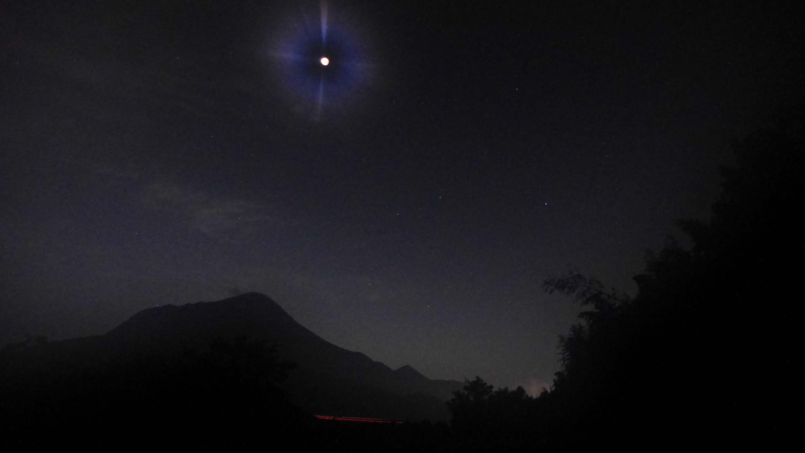 19時47分皆既月食中、星・由布岳・飛行機と