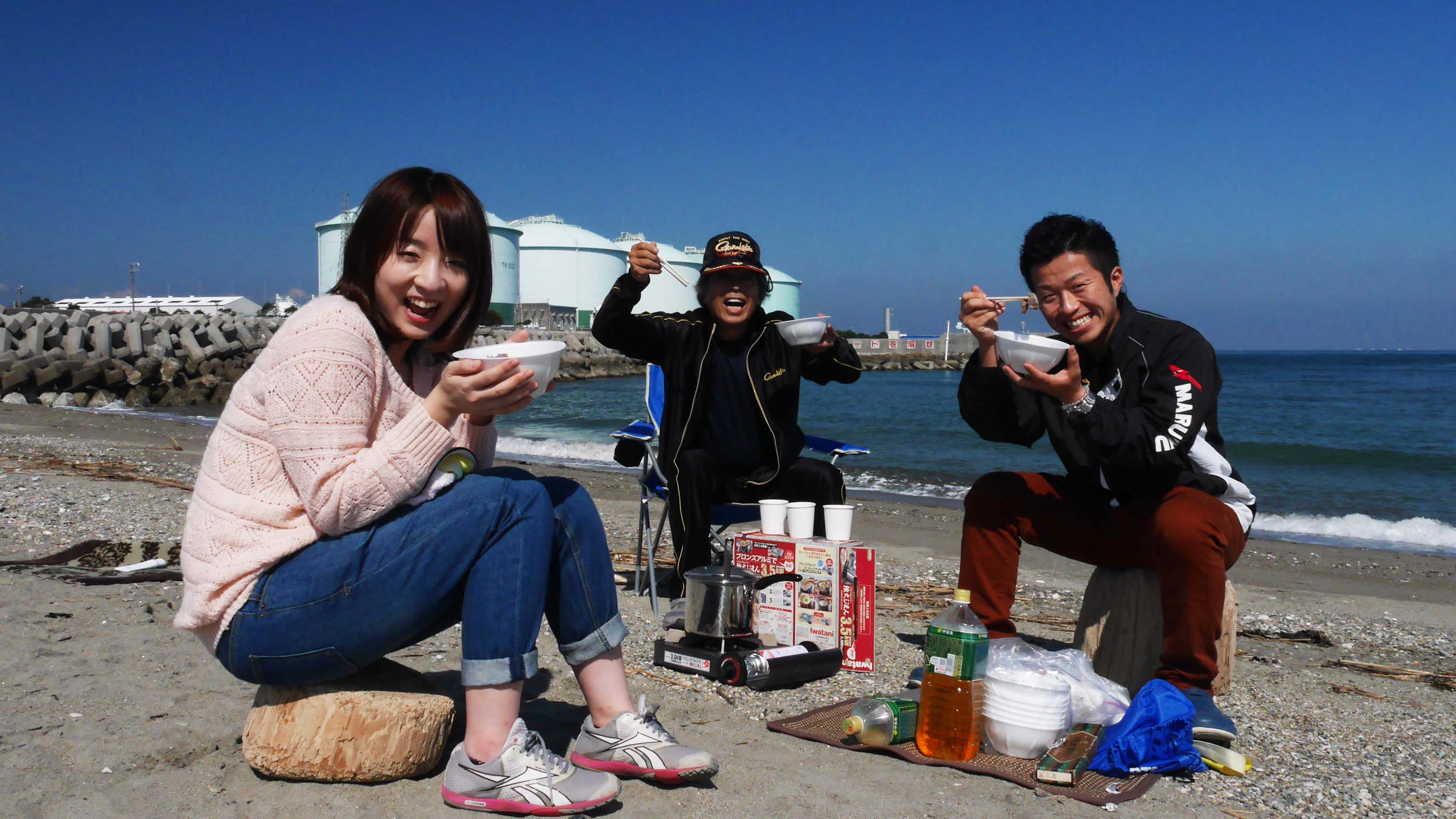 釣りの前に食事です。前日の夜に仕込んだ猪鍋を、綺麗な砂浜の波打ち際で温めて頂きます。ワイルドな料理ですが、自然の中での暖かい手料理は何とも言えない美味しさです。仕上げにラーメンをブチ込んで臨戦態勢を整えました。