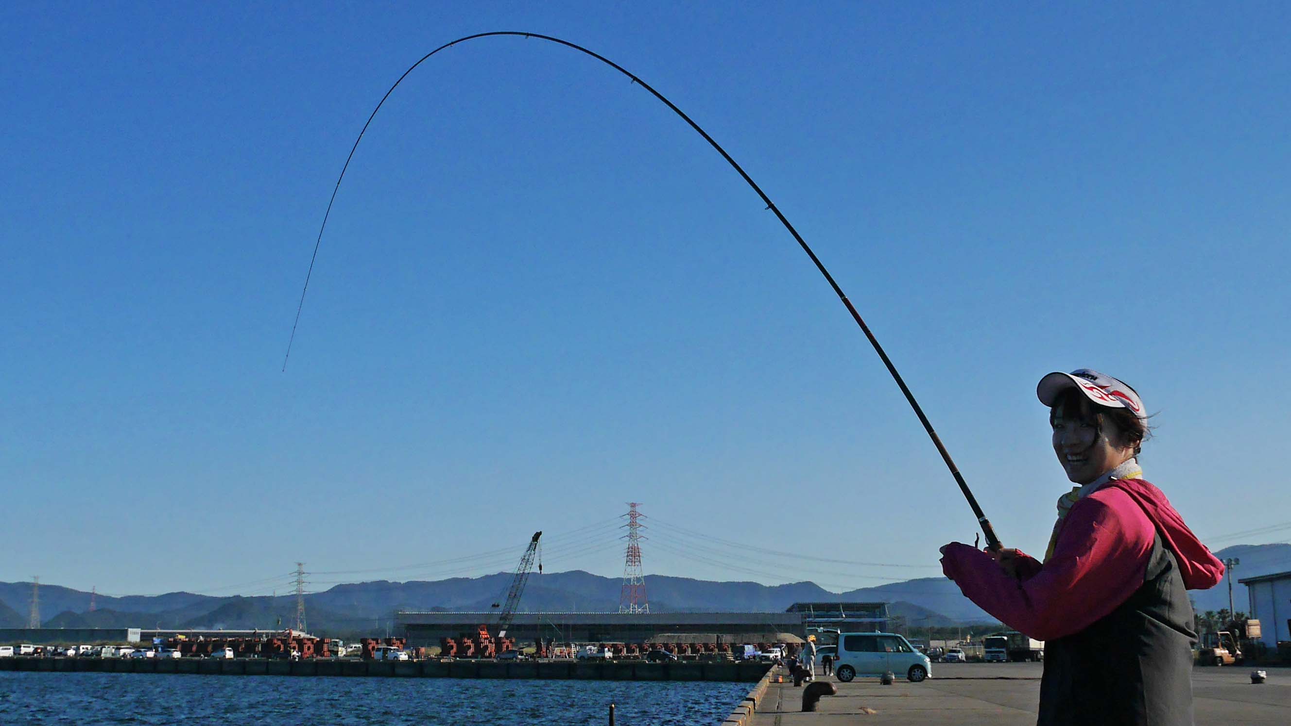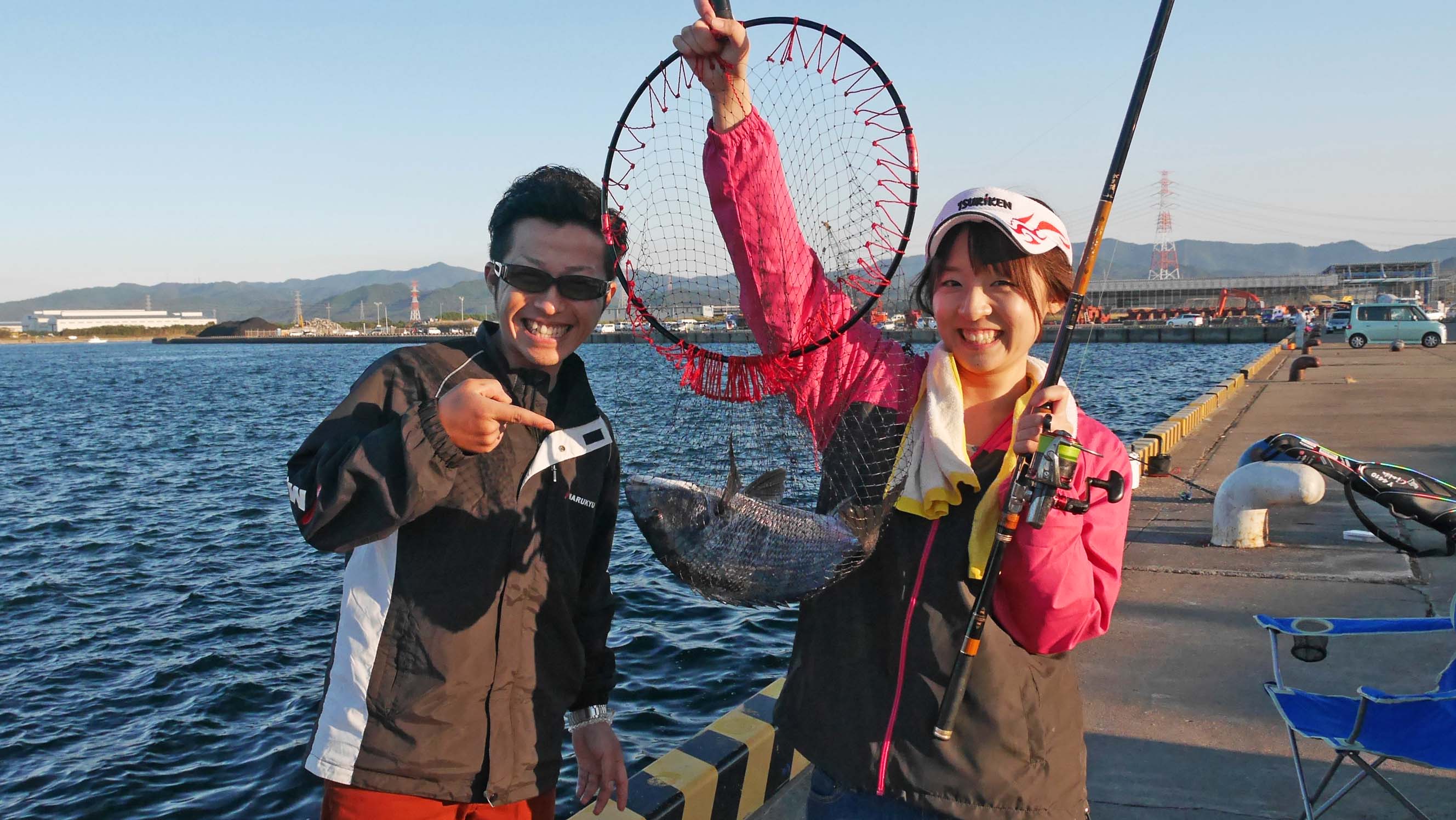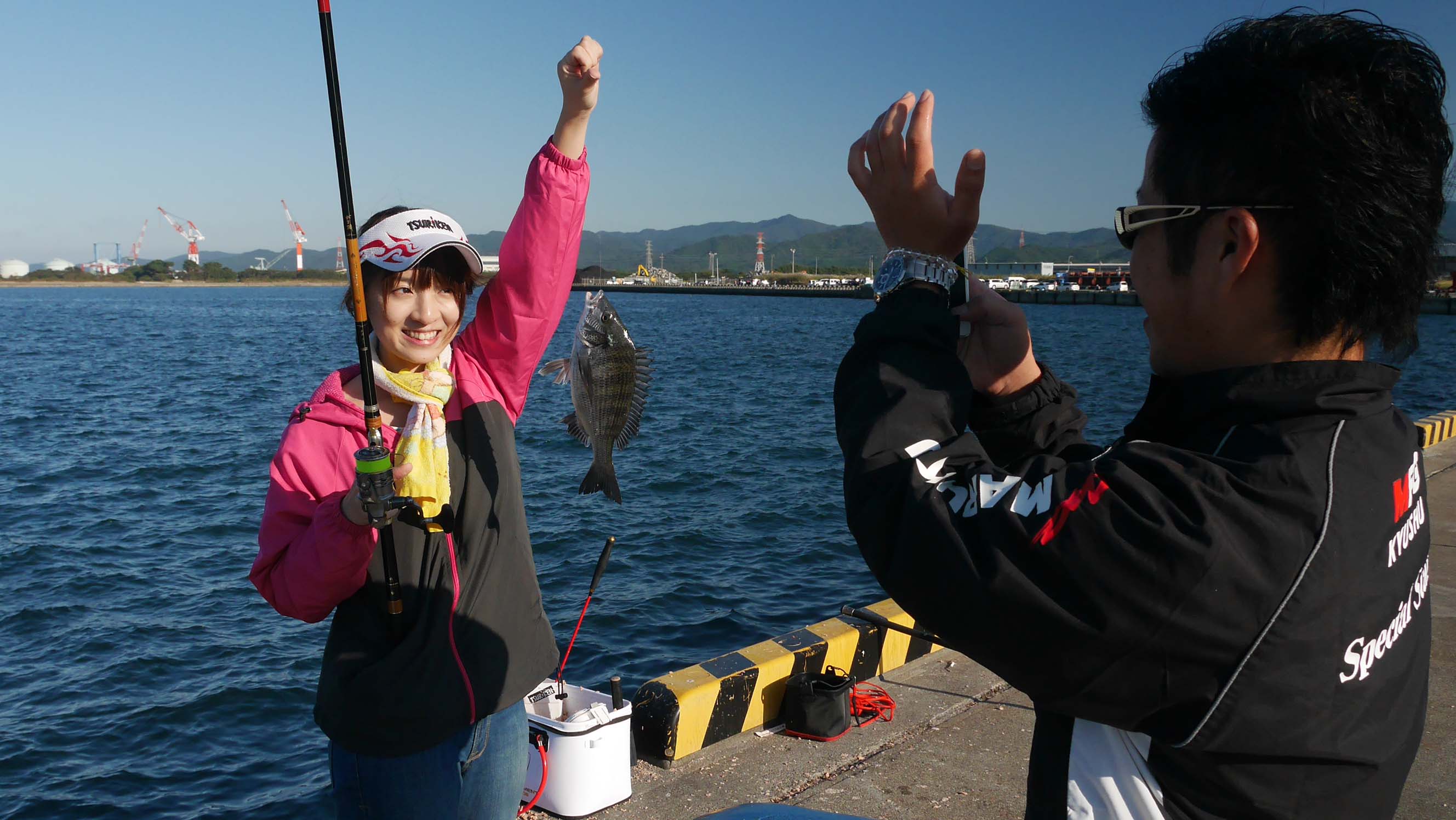 重くて強烈な走りが手元に伝わってきます。その竿を由香里ちゃんにバトンタッチです。ワーワー騒ぎながら巻いたり糸を引き出されたり数分の格闘です。初めての釣りで第一号がいきなり50㎝‼?大きなチヌが海面を割って姿を現したのです。