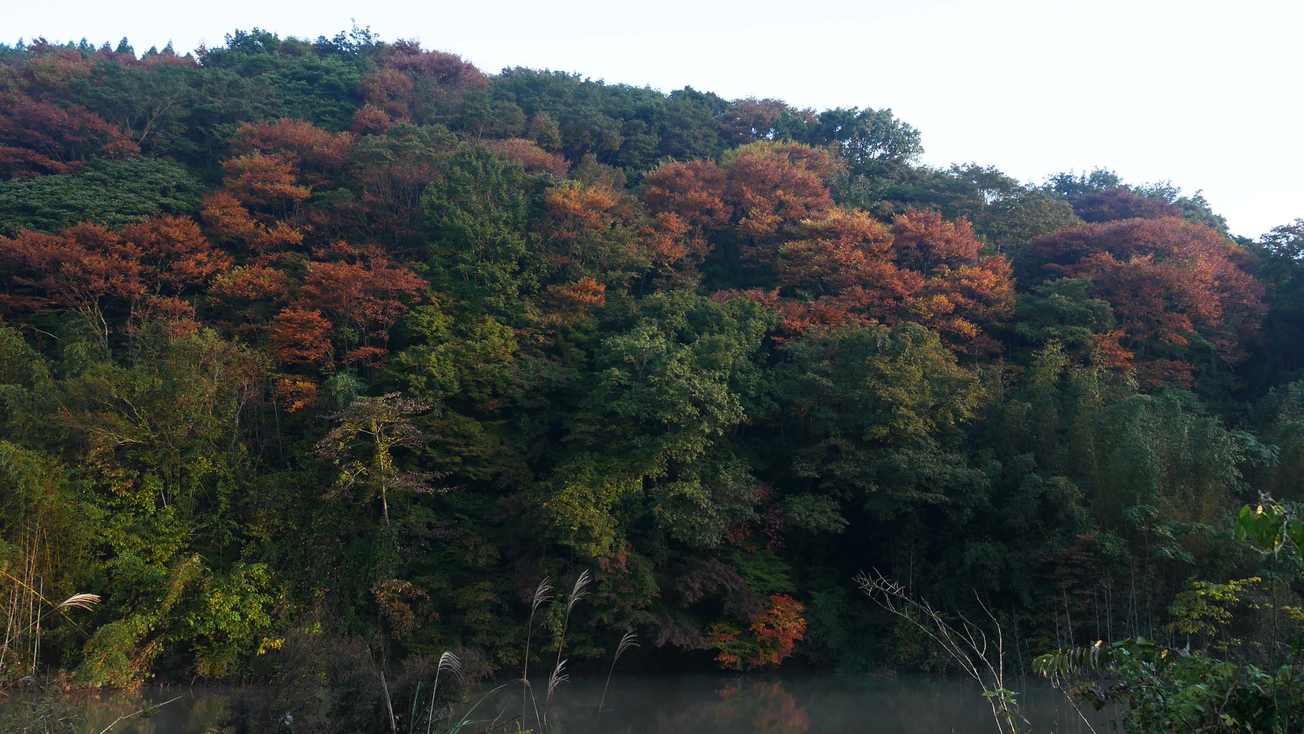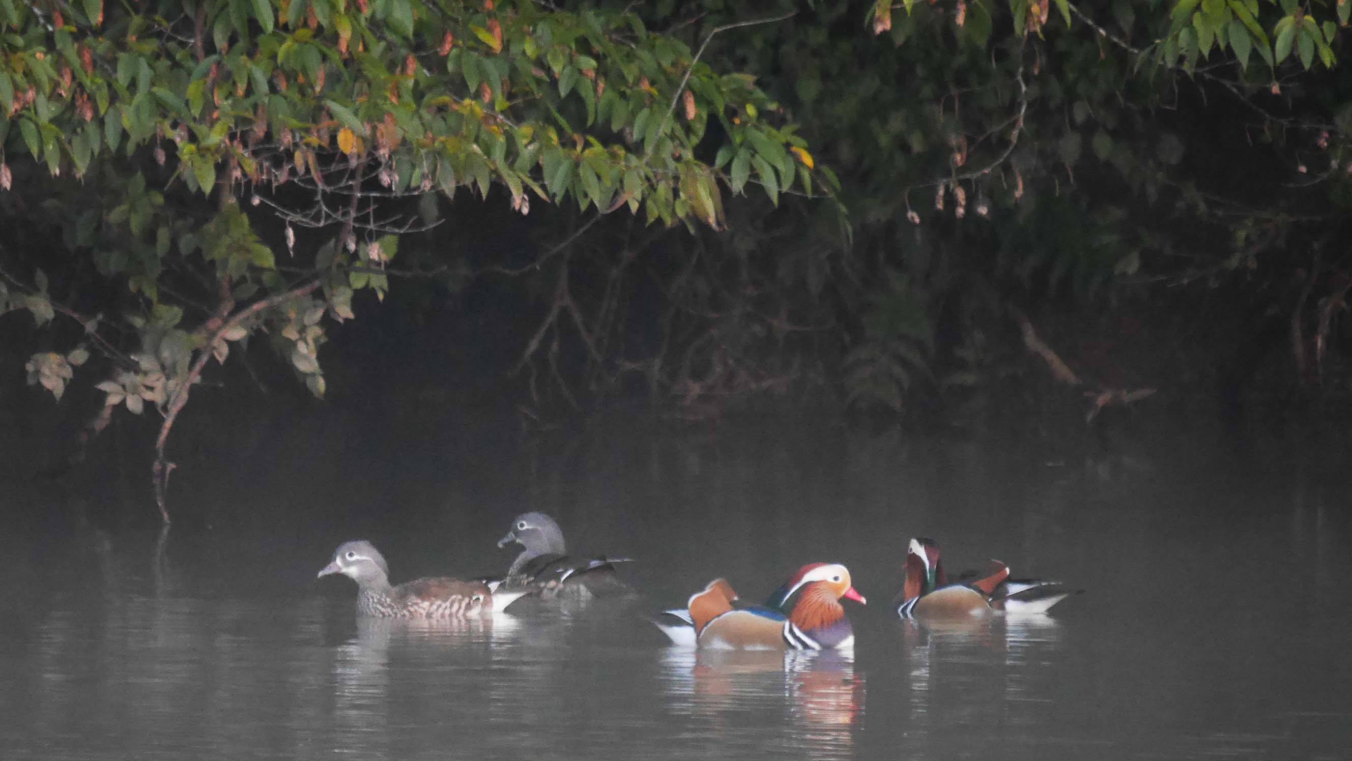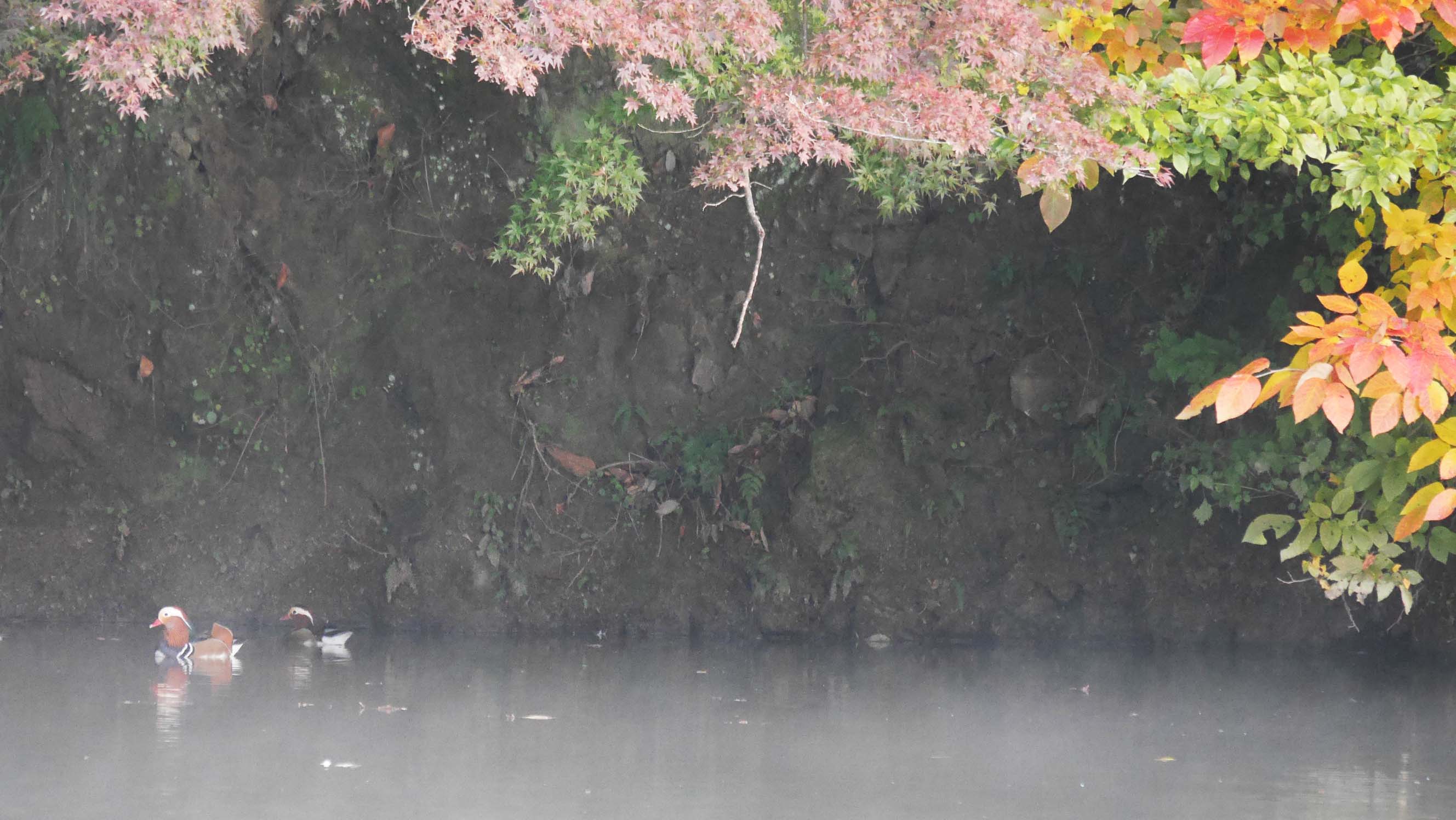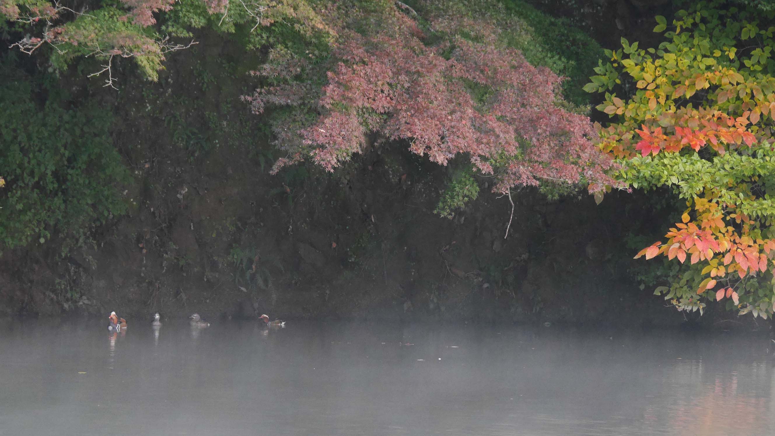 オシドリの数は30羽前後でしたが、夜が明けるに連れて群れごとに飛び去って行きます。でも別の小群が新たにやってきて、撮影出来る頃には6羽くらい?撮影で紅葉とのコラボを望んでいたのですが、そう上手くは行かないもの。近くまで行ったのですが、どこかへ飛び去ってしまいました。