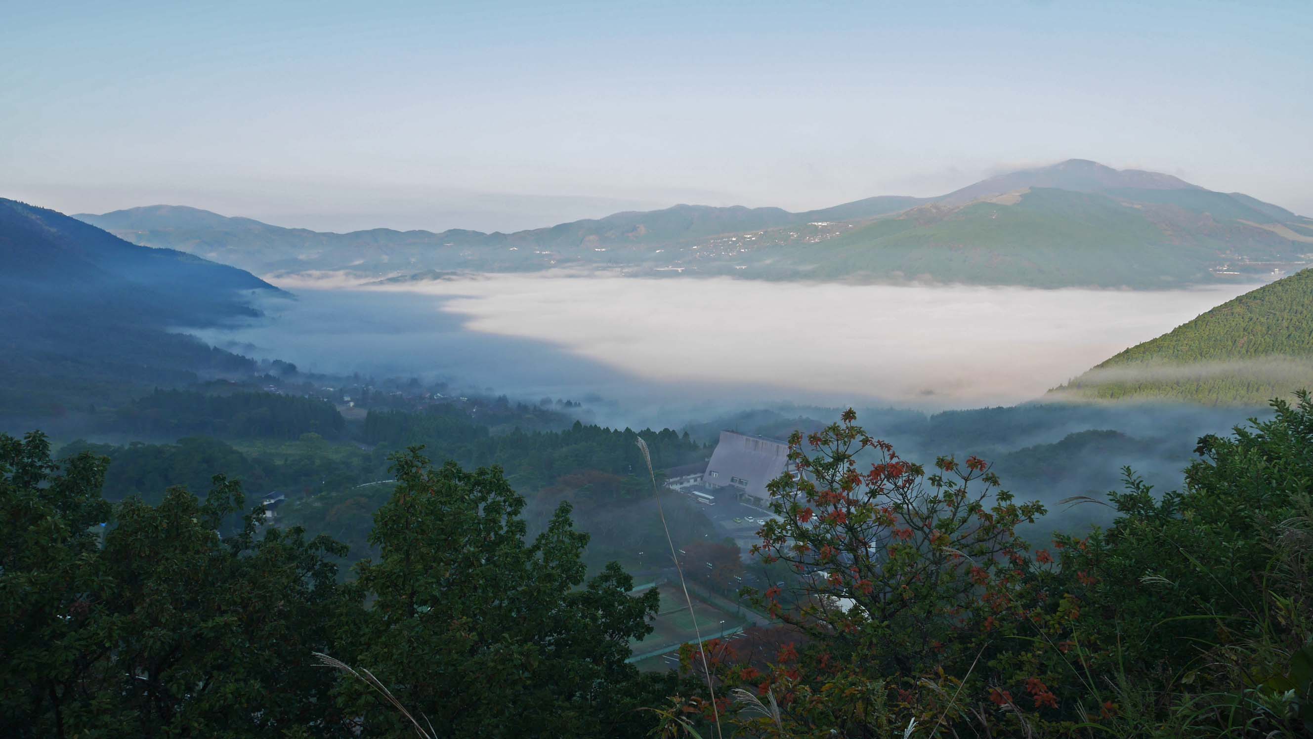 朝霧に包まれた由布院。狭霧台の展望所は朝から多数の観光客でした