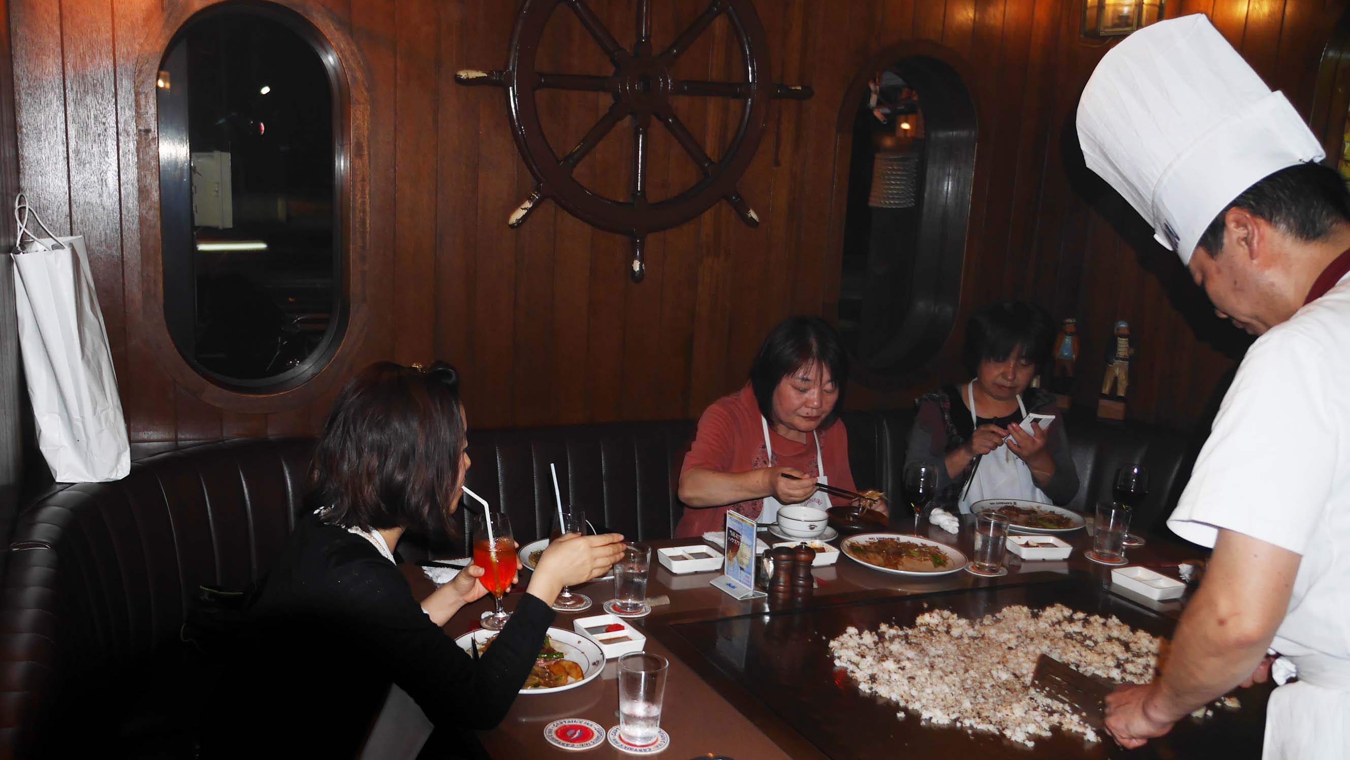 今回はキャプテンズイン(沖縄と姉妹店)で、いつものメンバーが揃って店長を囲んで美味しいお肉を頂きました。特にオーナーのパフォーマンスを間近で見ながら、順次お腹に入れていく肉や野菜・焼き飯などは腹一杯になっても入るものですね。
