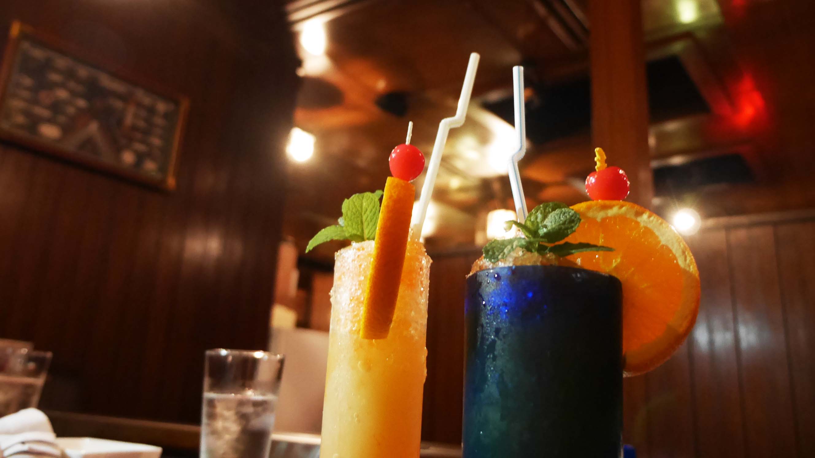 店内は少し薄暗いですが、船内をモチーフにしたシックな内装は落ち着いた雰囲気で、色々な装飾品などは異空間をも漂わせています。入口の両側にある古びた名刺の数々は、キャプテンズインが様々なお客さんとの歴史を刻んでいるのが伺えます。
