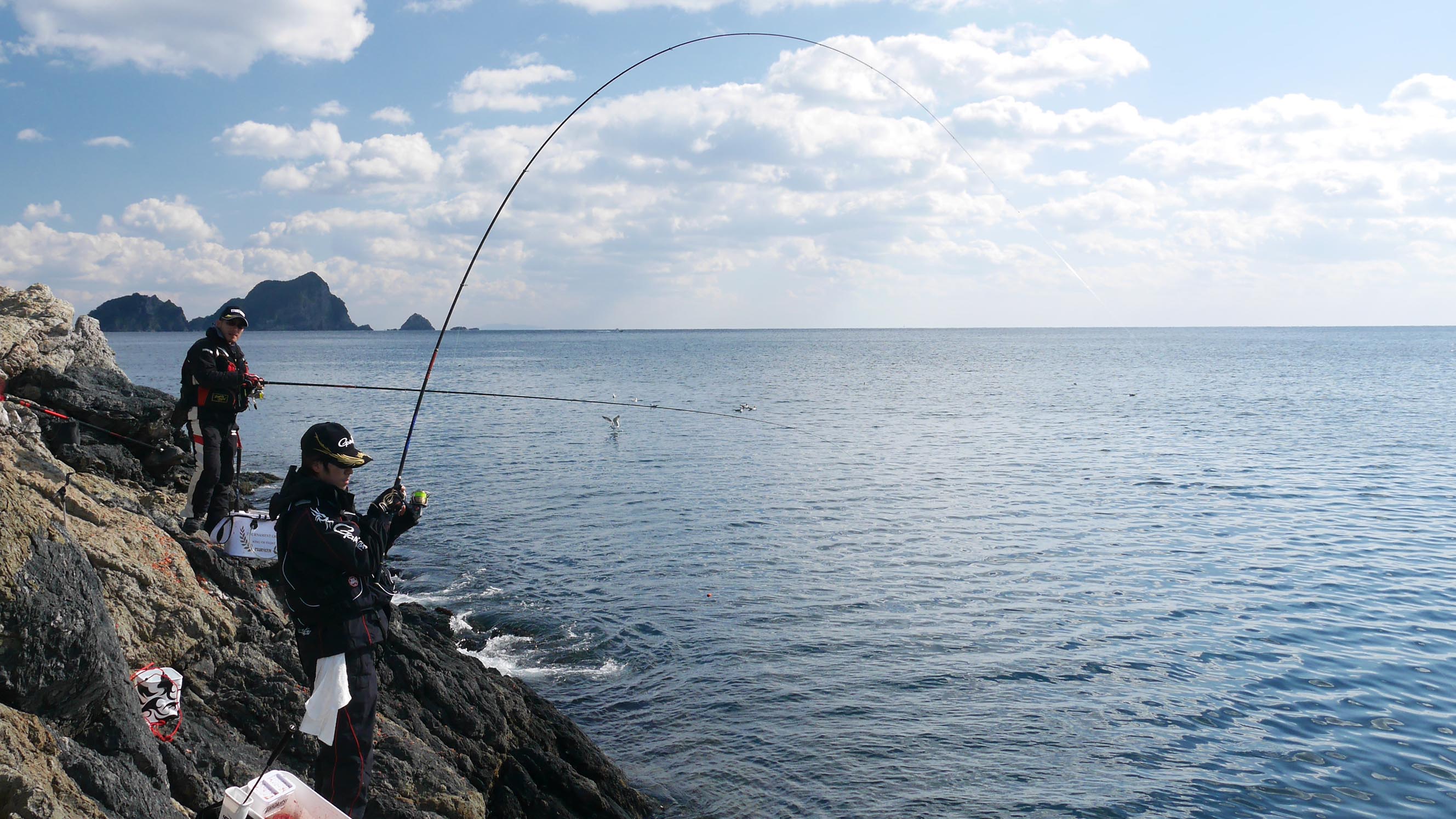 小貝バエのポイントは基本的に船着きと西の鼻で良く釣れます。その場所を若手に譲って10mくらい東側の少し低い足場から竿を振っていると・・・3匹目に強烈なアタリ、磯際に突っ込んでくる大物を何とかなだめて巻き込んでいるとプッツンです。