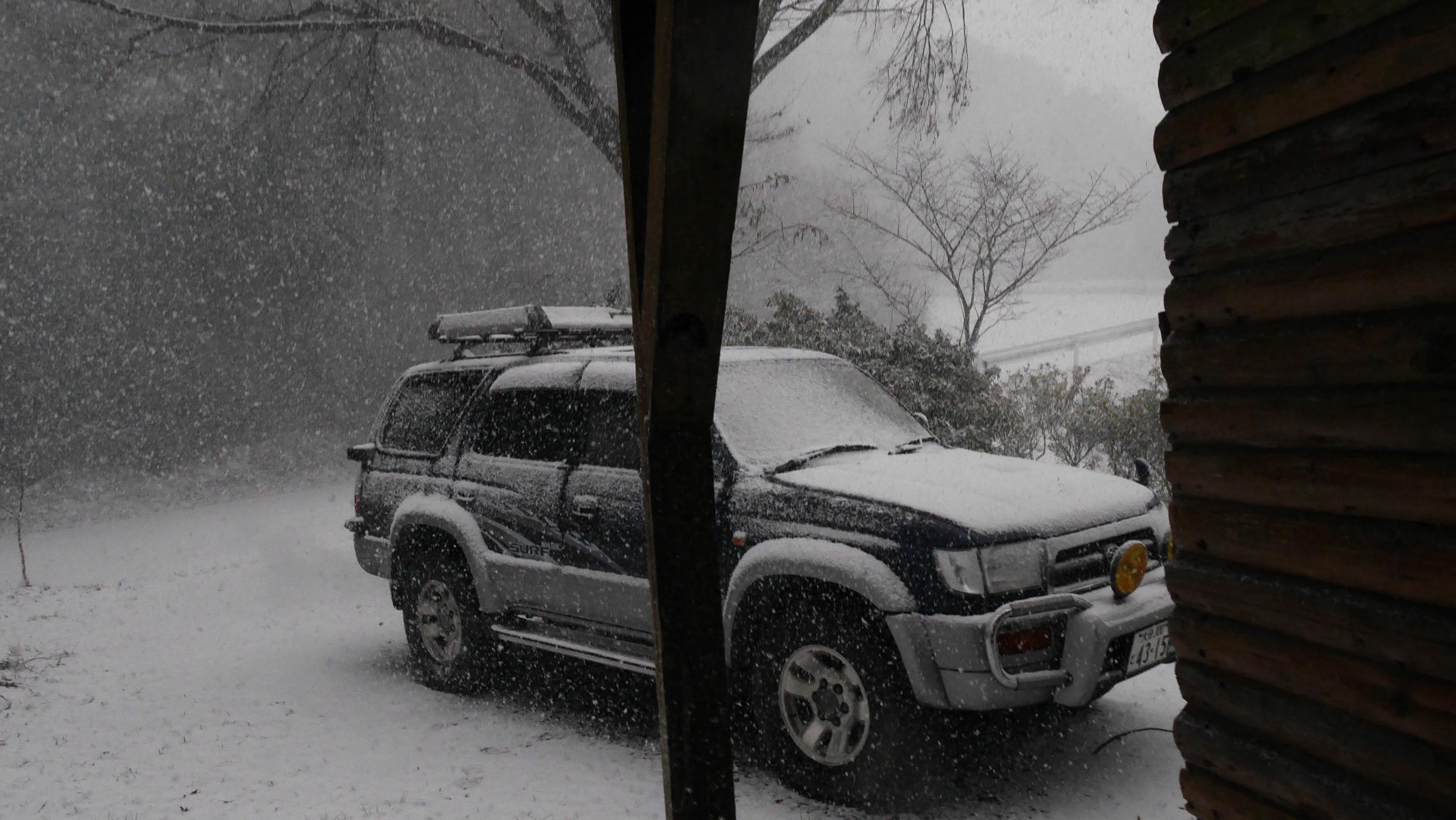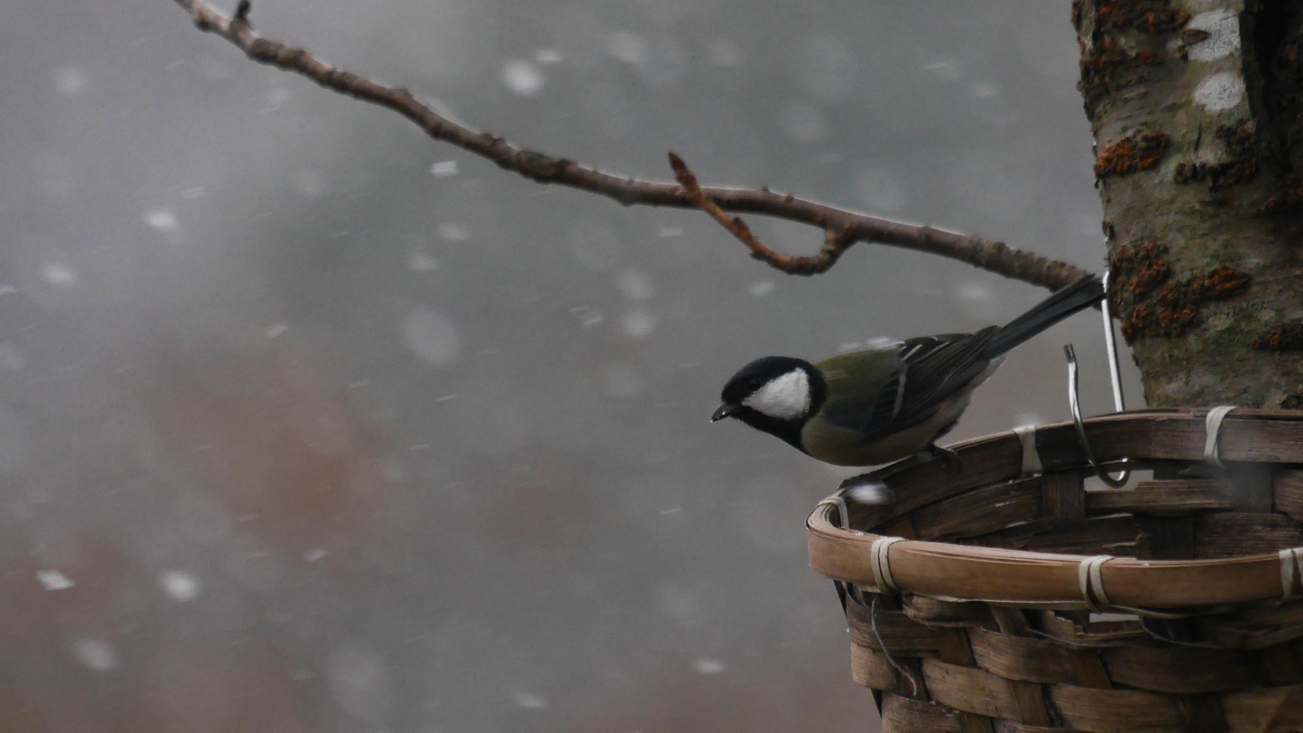7時頃から9時前まで雪は落ちていませんでしたが、ラジオから流れる情報では大分市内は吹雪が舞っている話しをしています。そのうち県民の森にも雪が落ち始めたので、雪と野鳥のコラボ写真を撮る事にしました。