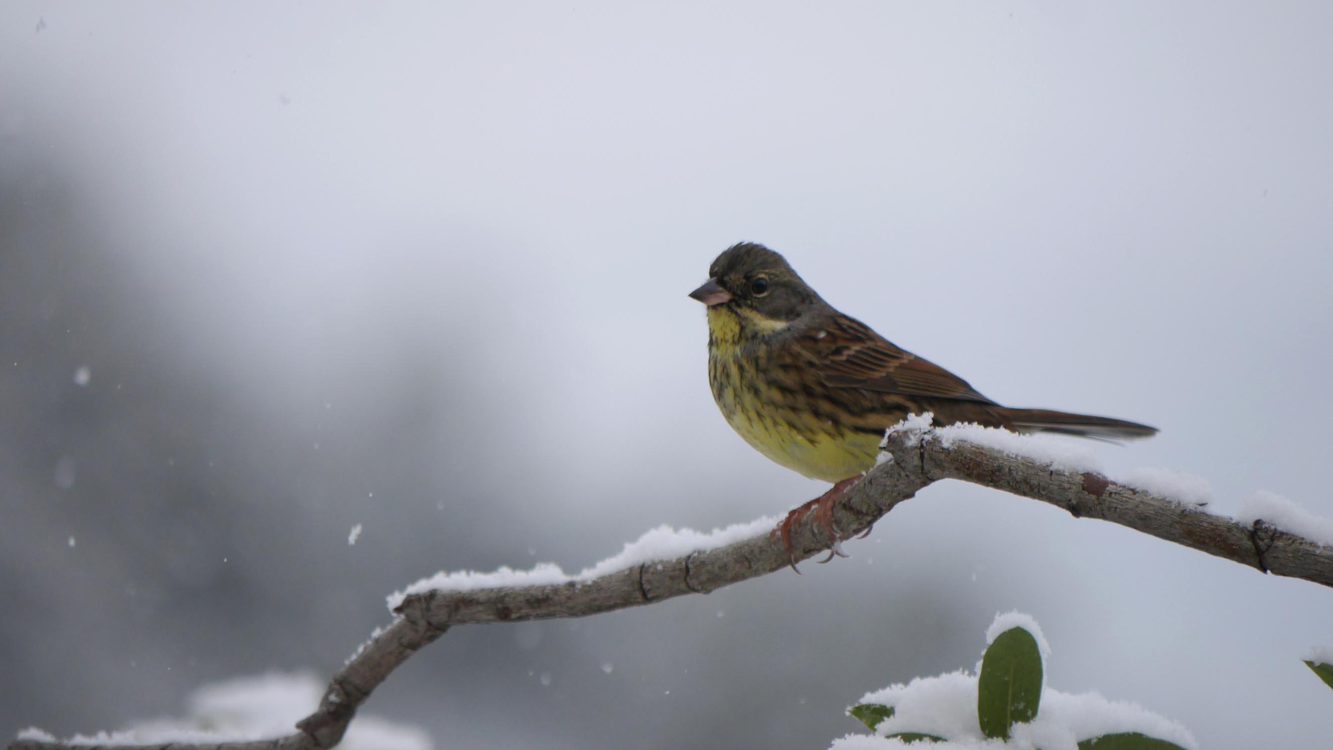 アオジ。雪が小降りになると再び小鳥達が動きはじめ