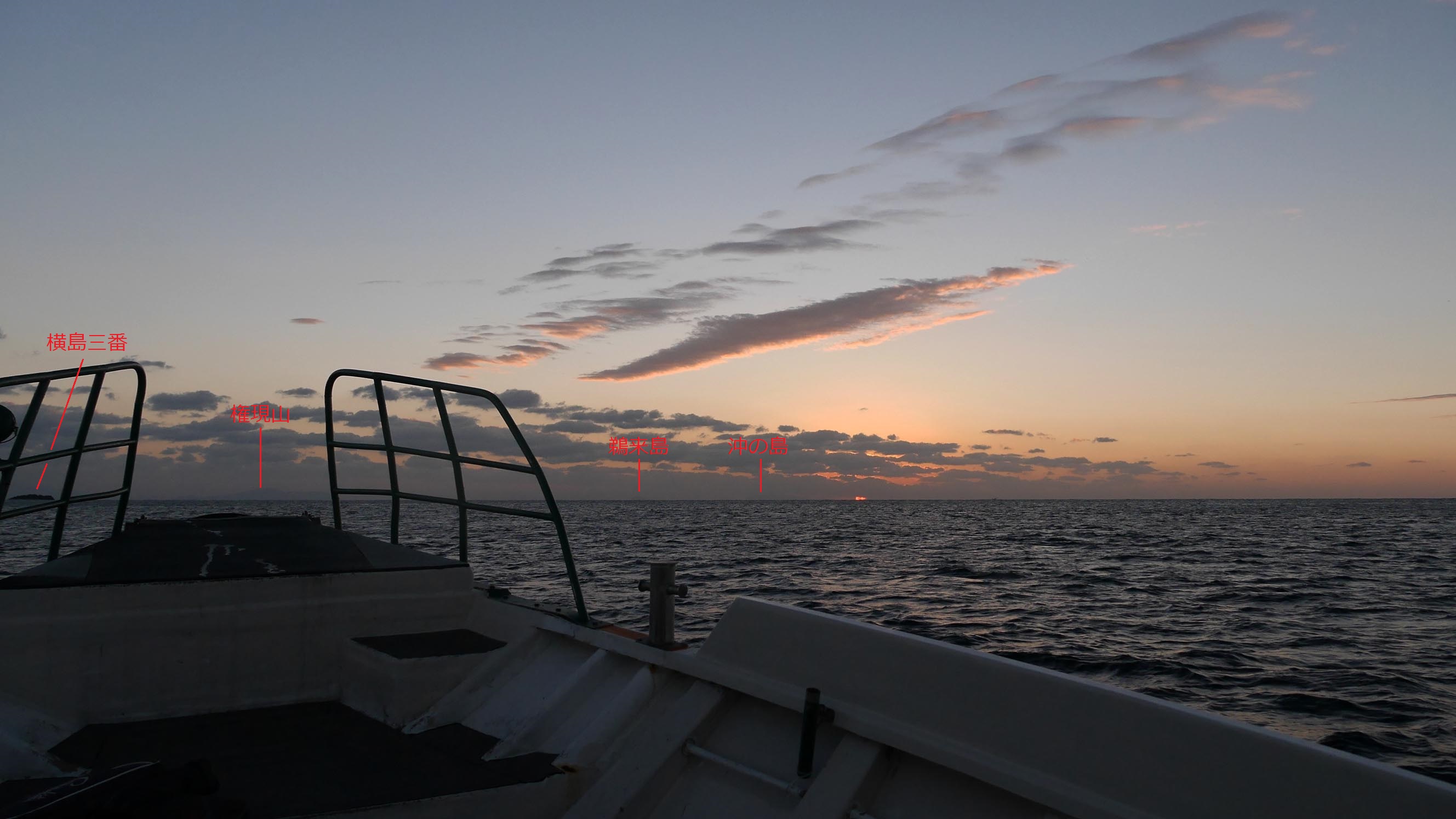 東の方向はいつもの様に四国に雲がかかっており、この時期は沖ノ島の南側から顔を出す、お日様の一部分だけを見る事が出来ました。日の出などを写す時、鶴御崎より南の大分県から狙うと、気象条件が合えばダルマ朝日も写せるチャンスがあります。