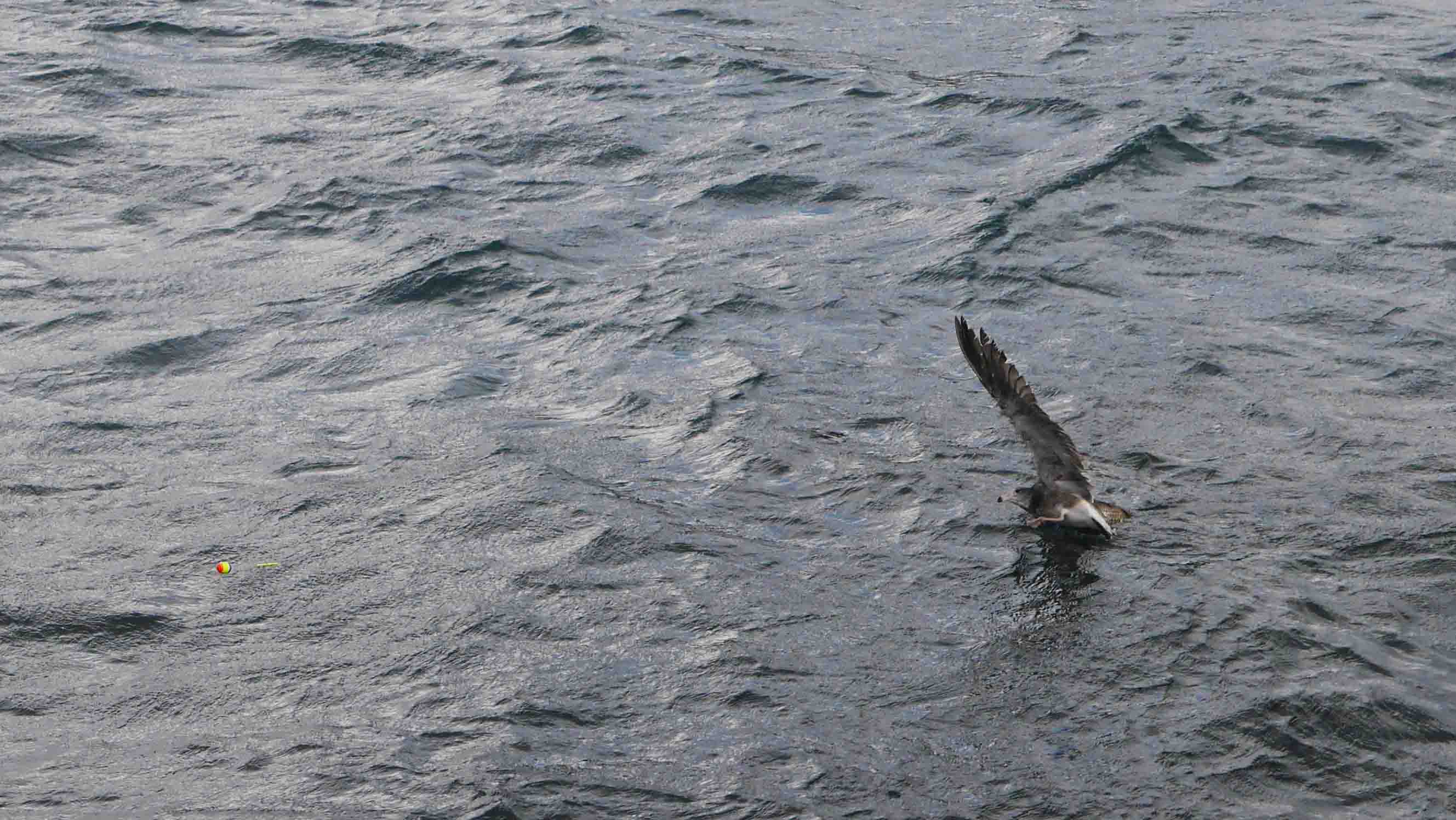 冬はエサが乏しくなるので、釣り人が撒くマキエのオキアミが浮いて流れると、それを狙ってウミネコやセグロカモメ・ユリカモメなどがやってきます。流れているオキアミを喰う分には良いのですが、仕掛けを投入した直後にハリの付いたオキアミを喰って舞い上がると、今回の様な写真になってしまいます。