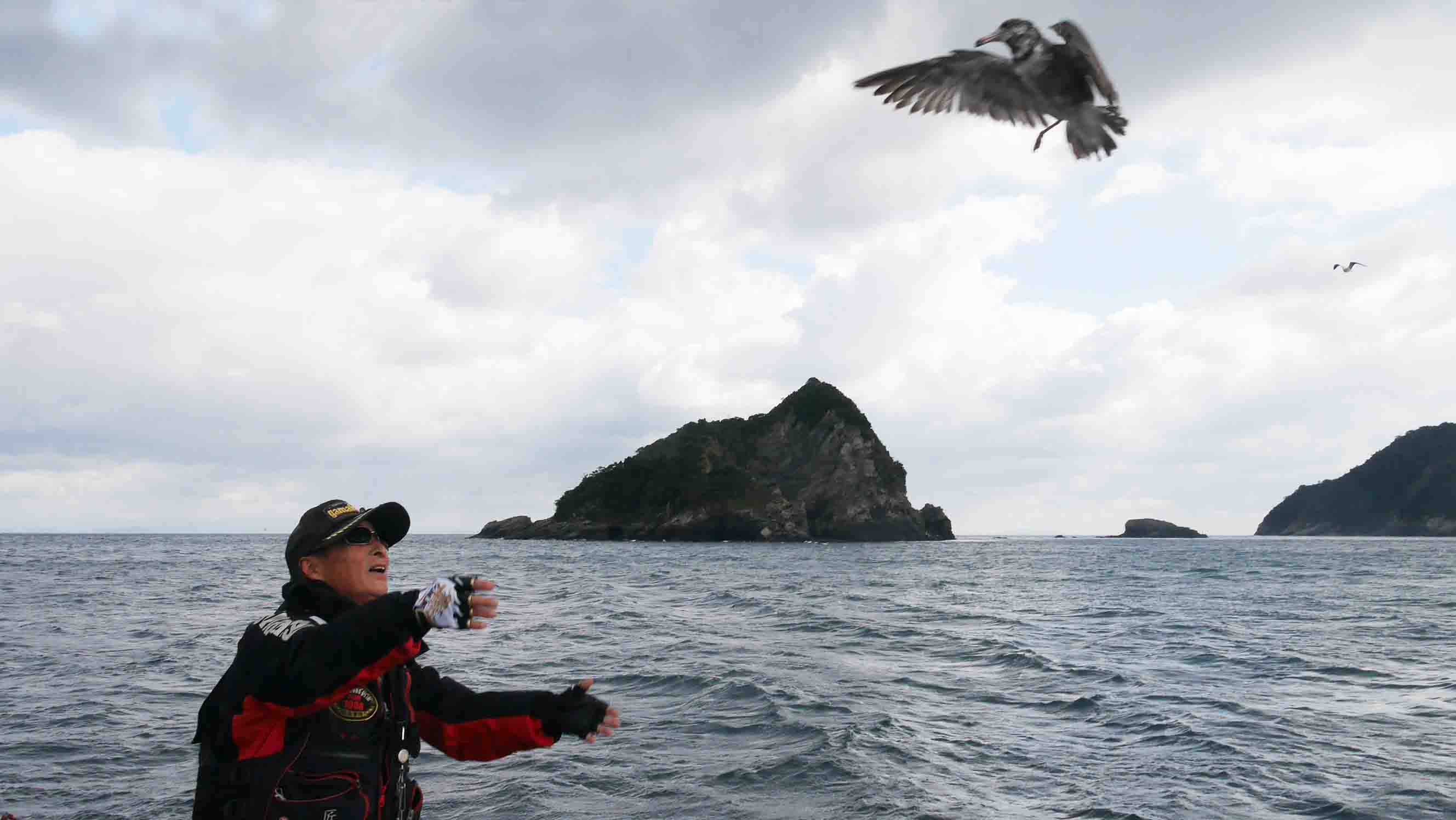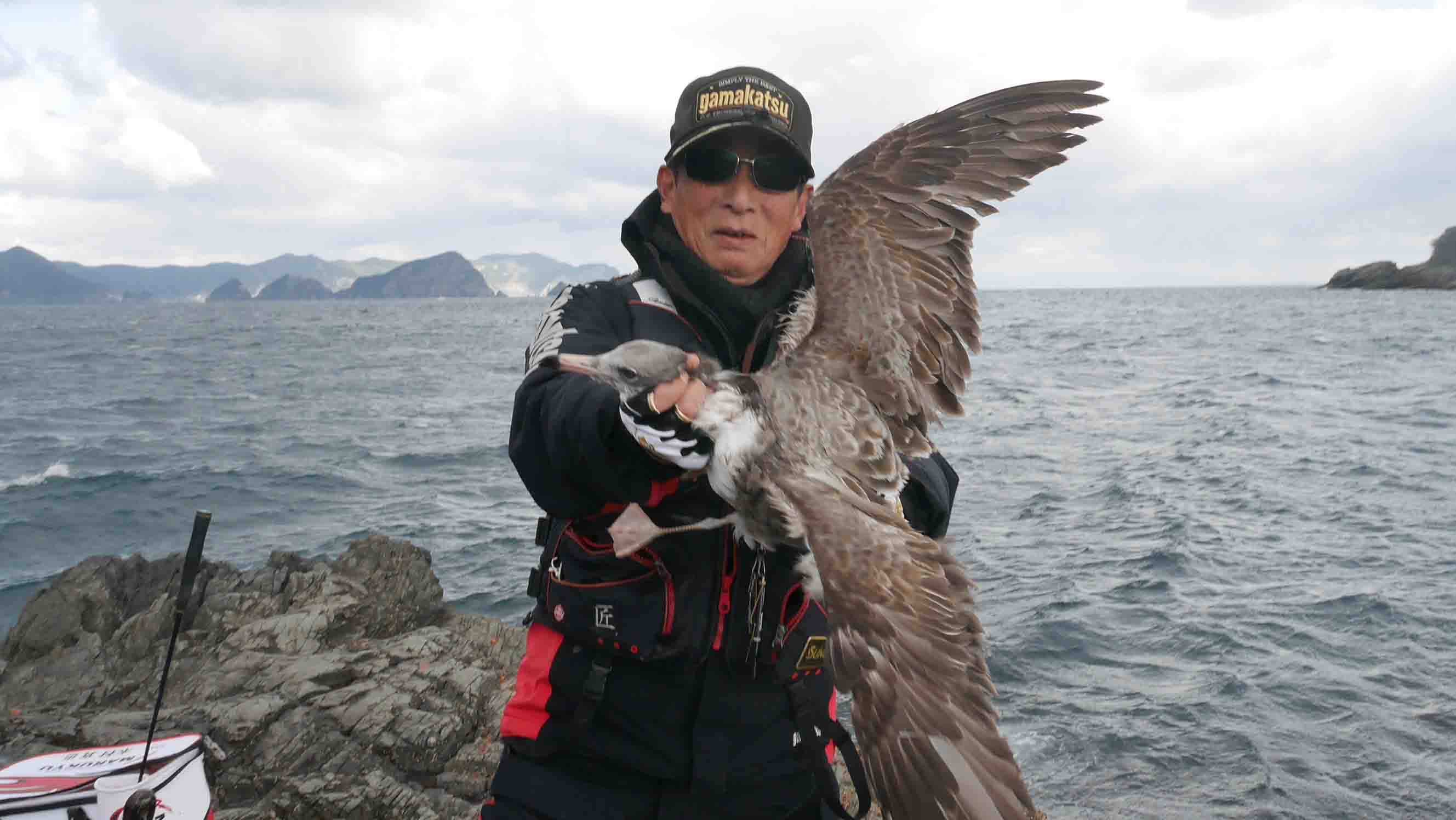 セグロカモメの若を釣った松本会長。冬の磯では時々起ってしまう鳥釣りです。