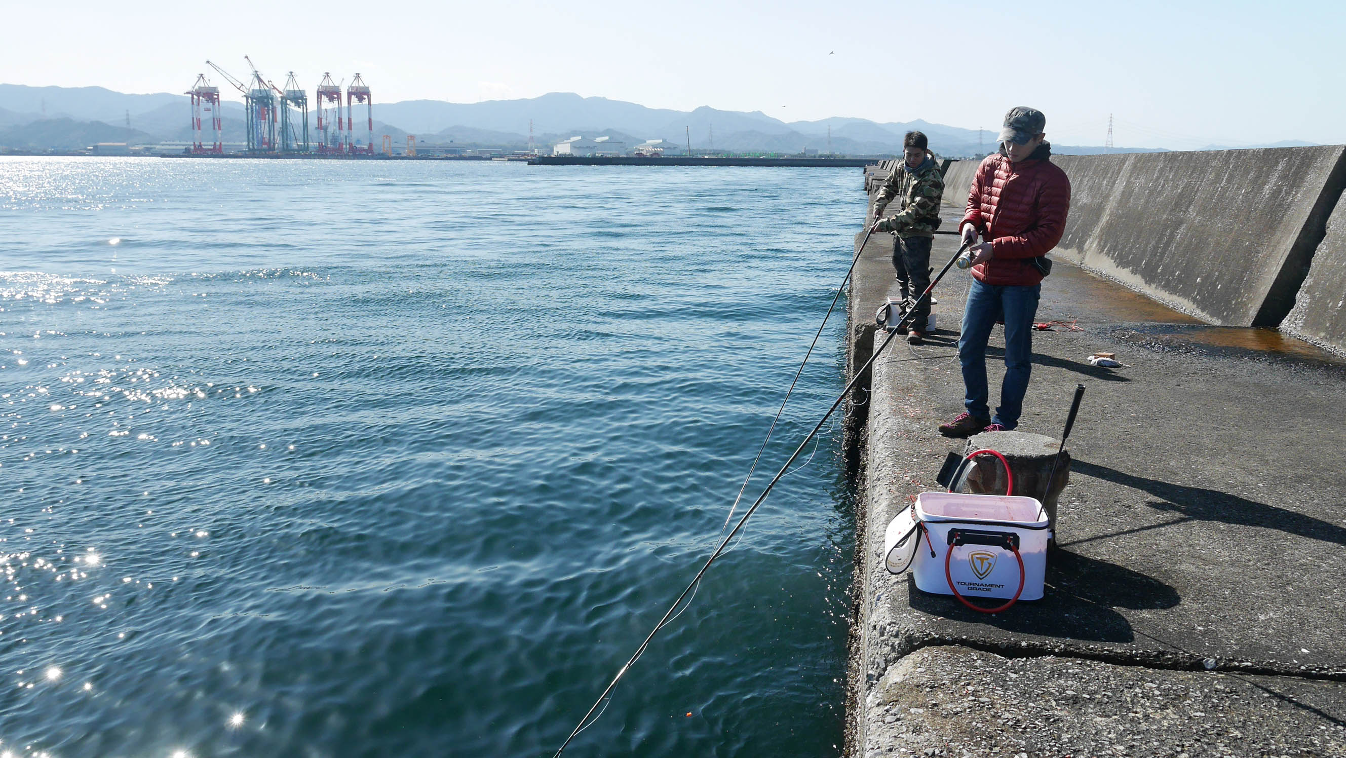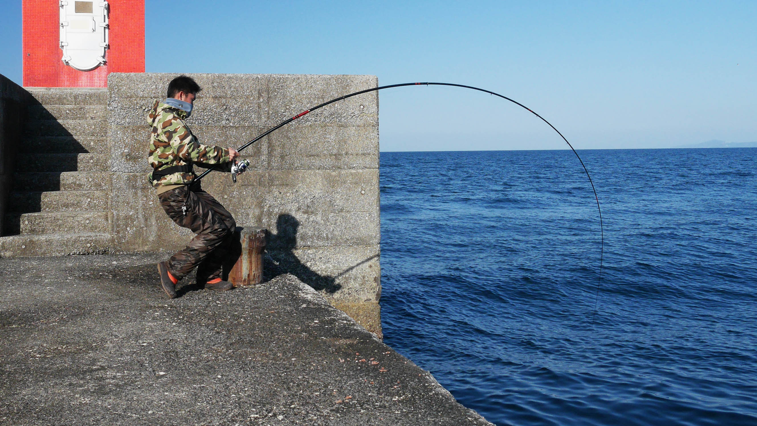 こんな感じで岸壁近くを狙います。道糸は繰り出さずについて行きながら狙います
