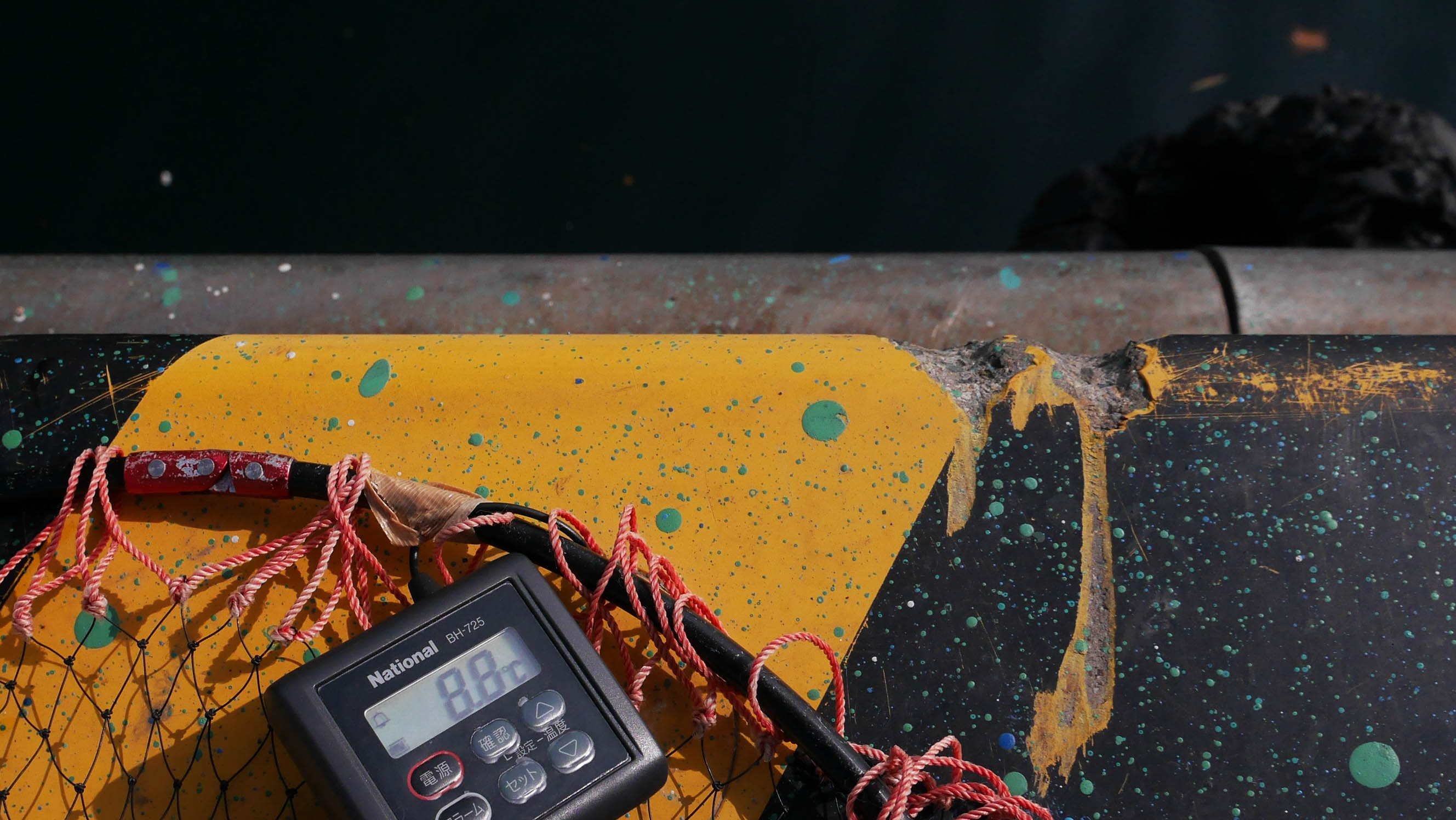 最初は同じ港内の新波止で竿を振りましたが、チヌもカンダイ狙いも不発です。北風が強くなったので、食事後の午後から通称“倉庫裏”へ瀬替わり?です。午後からの私は釣りをせずに撮影係り。海水温を測ると案の定10℃を切っていました。