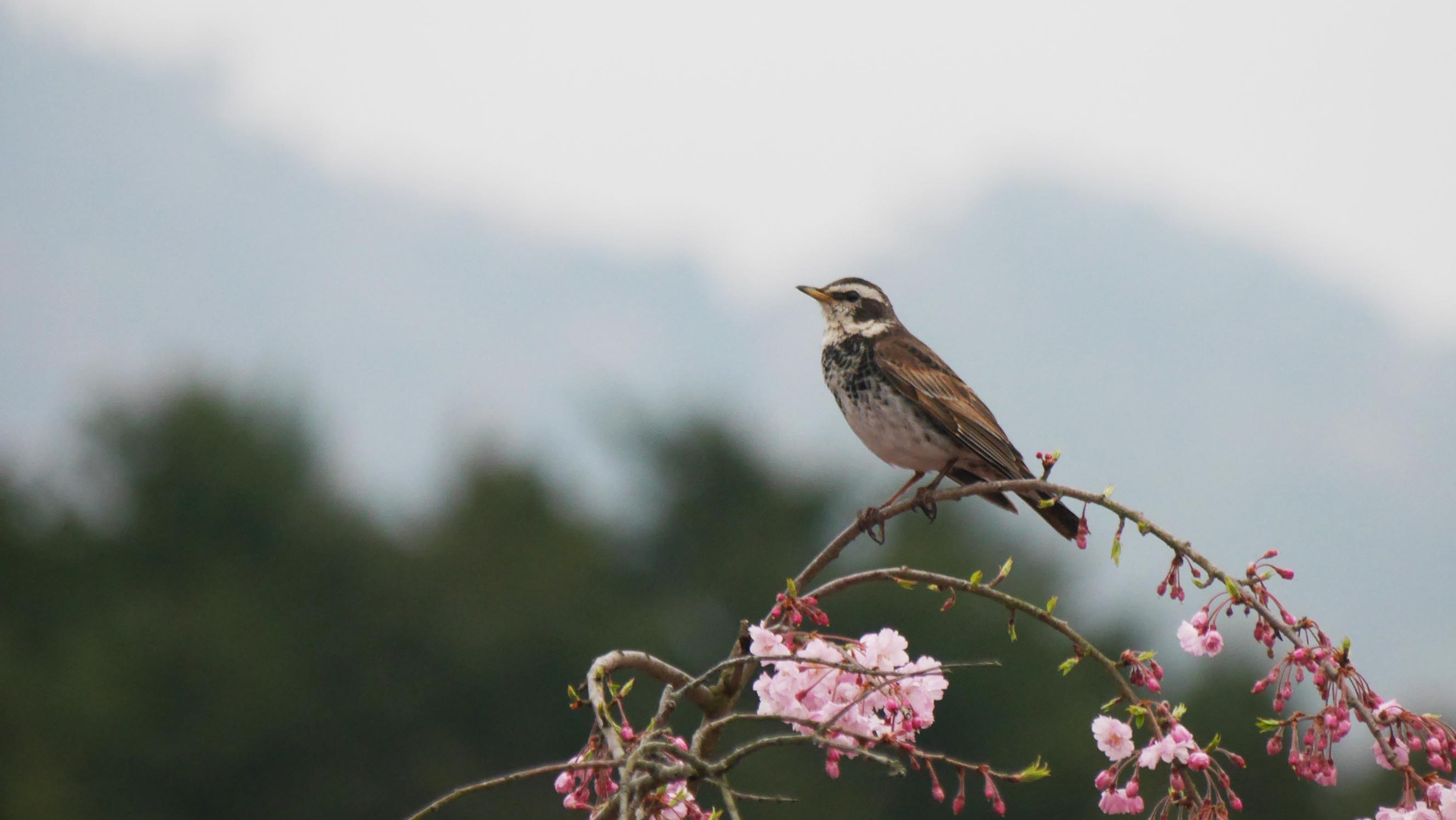 今朝の枝垂桜とツグミ(冬鳥)