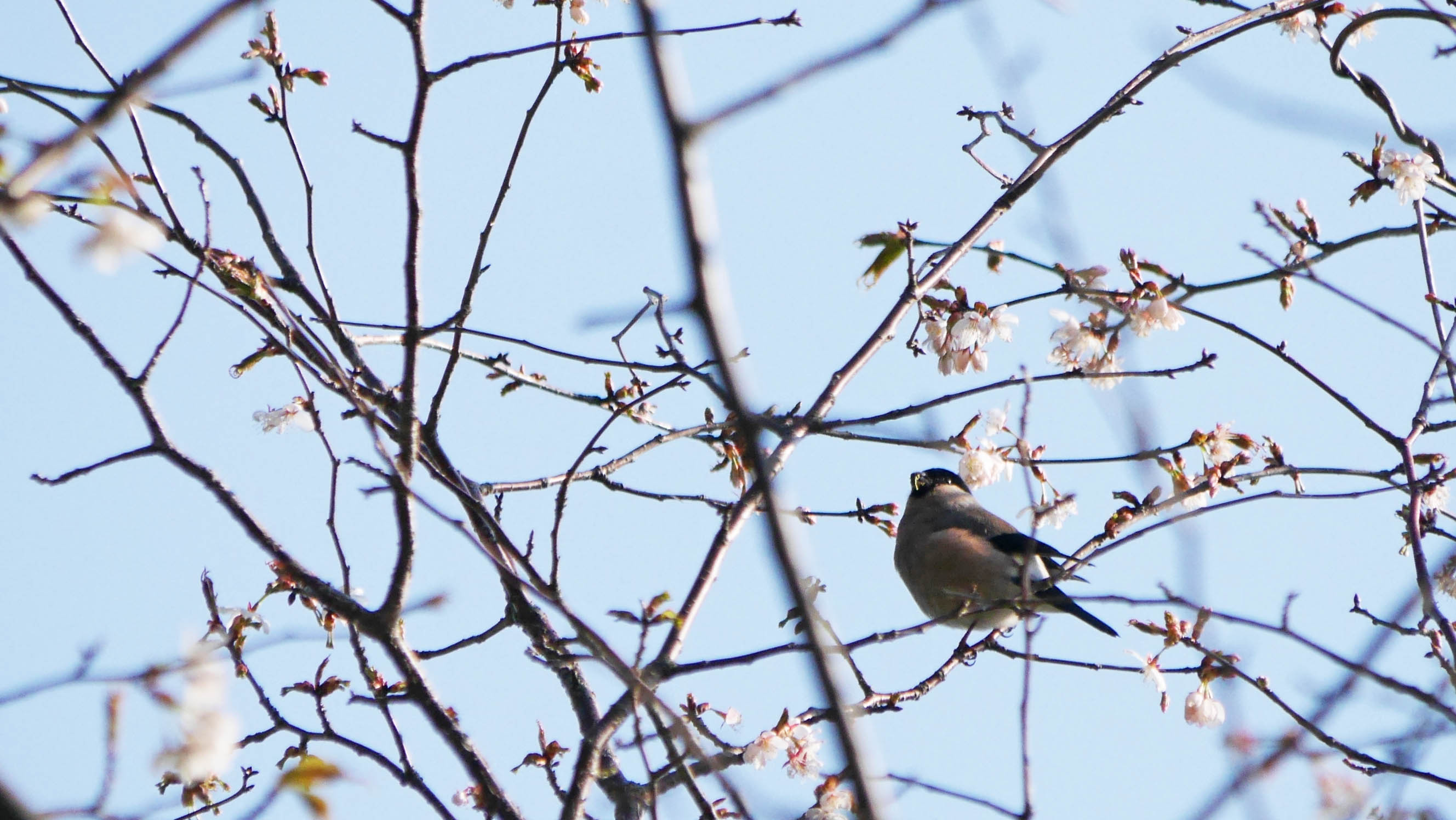 その直後、冬鳥のウソが2羽でやってきて、遅咲きの山桜の花芽を啄みはじめました。付近ではクロツグミと思われる地鳴きが度々・・・番いになったと思われます。