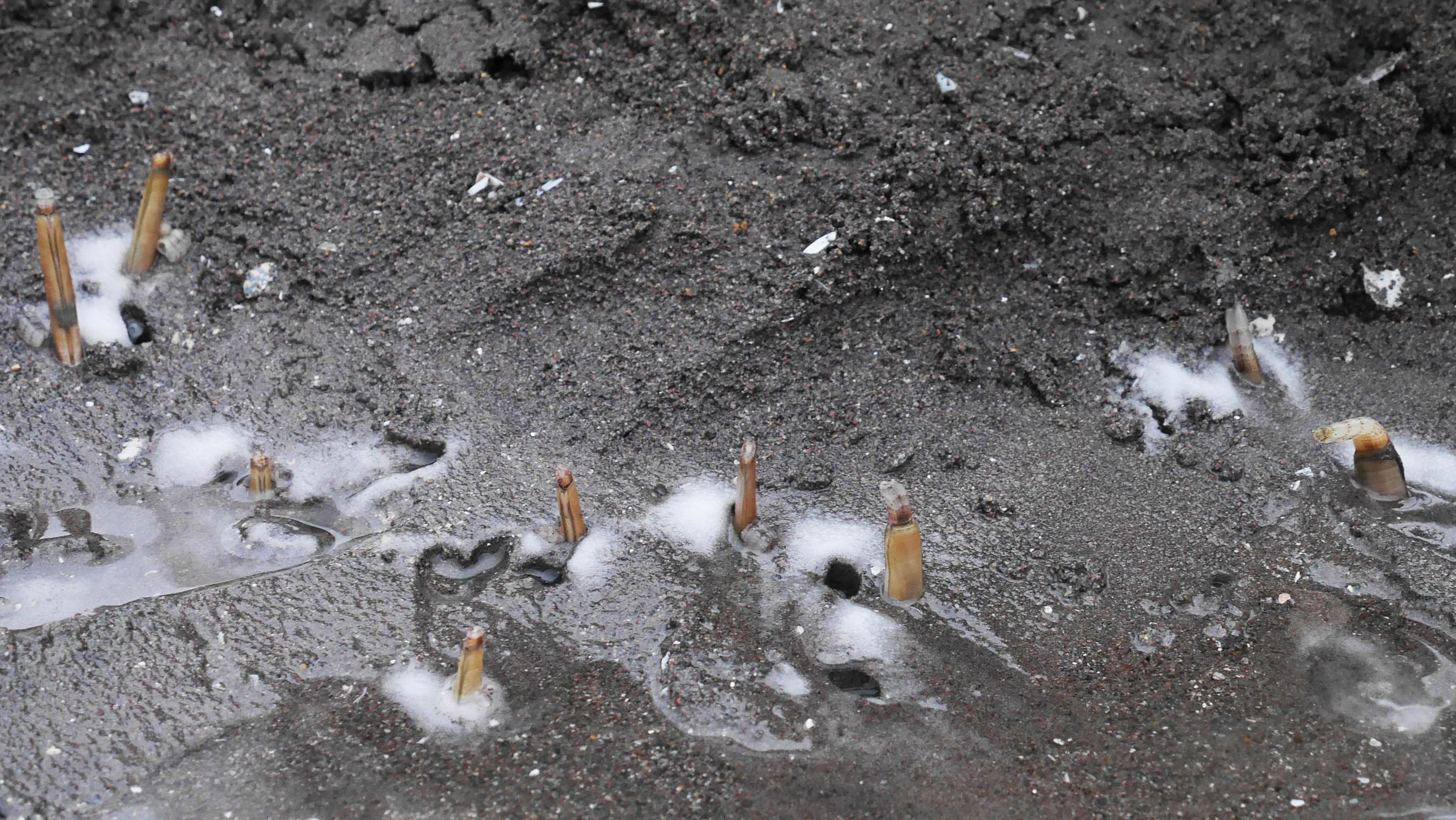 それでも、いつもの場所までまっしぐらに進んで、砂を少し掻いてみるとマテガイの穴が点々と続き、数か所だけでかなりのマテガイをゲットすることが出来ました。