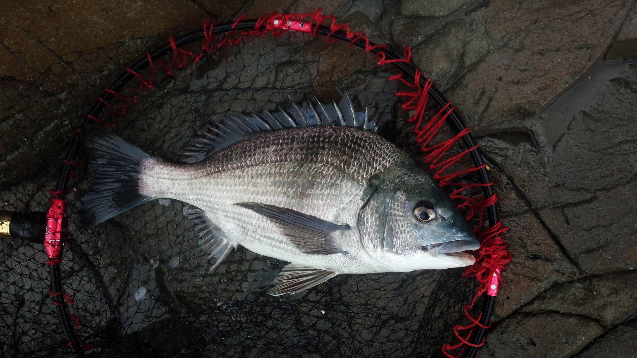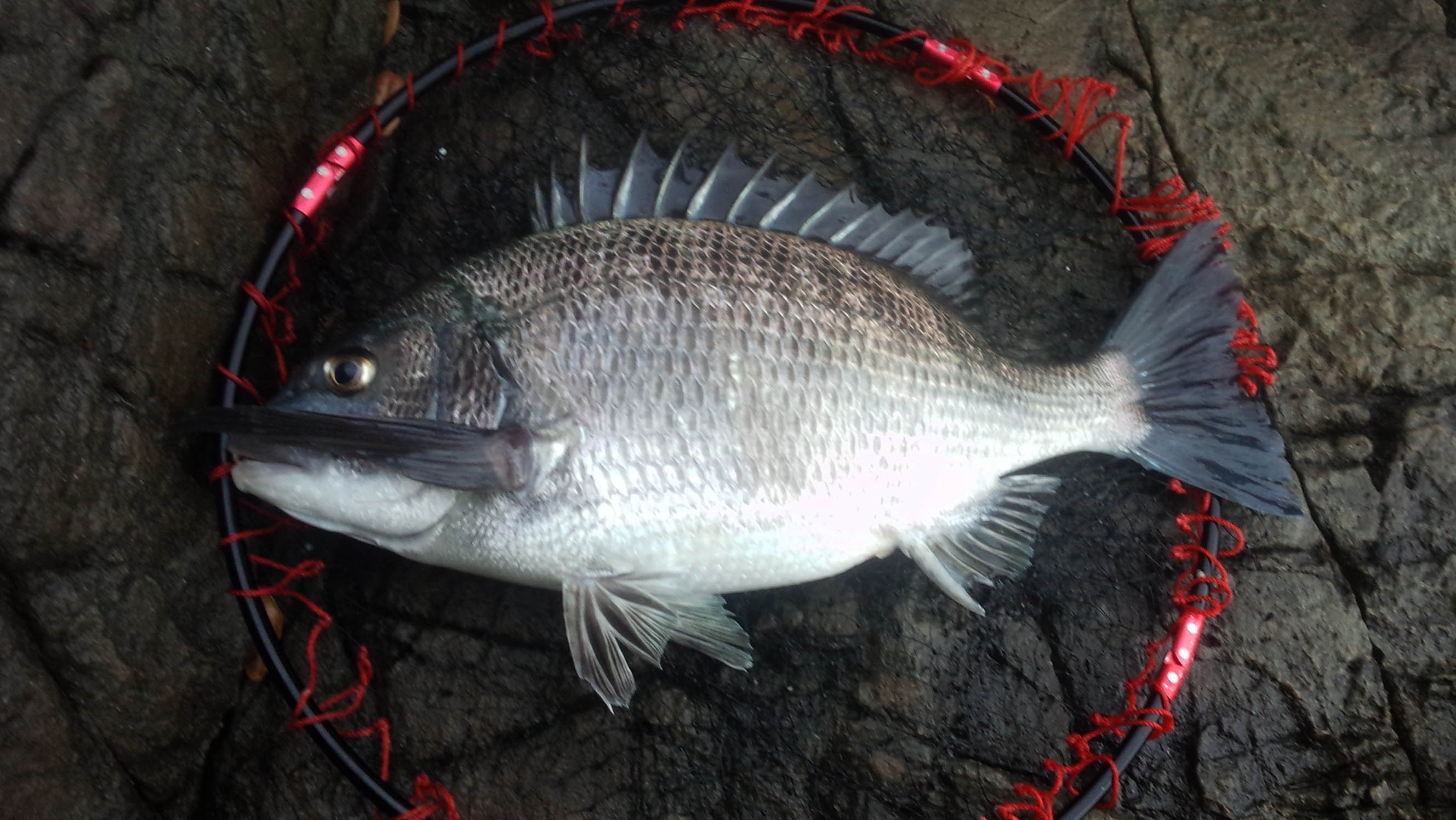 直後にはイラがヒットしましたが、その後の2流しはエサを取られてしまいました。そこで本命ポイントのマキエを止め、磯から15m位の場所をを2回程流してポイントを休め、次の一投は本命ポイントへマキエを20杯近く打ち込んで2㎏オーバーのチヌをゲット。