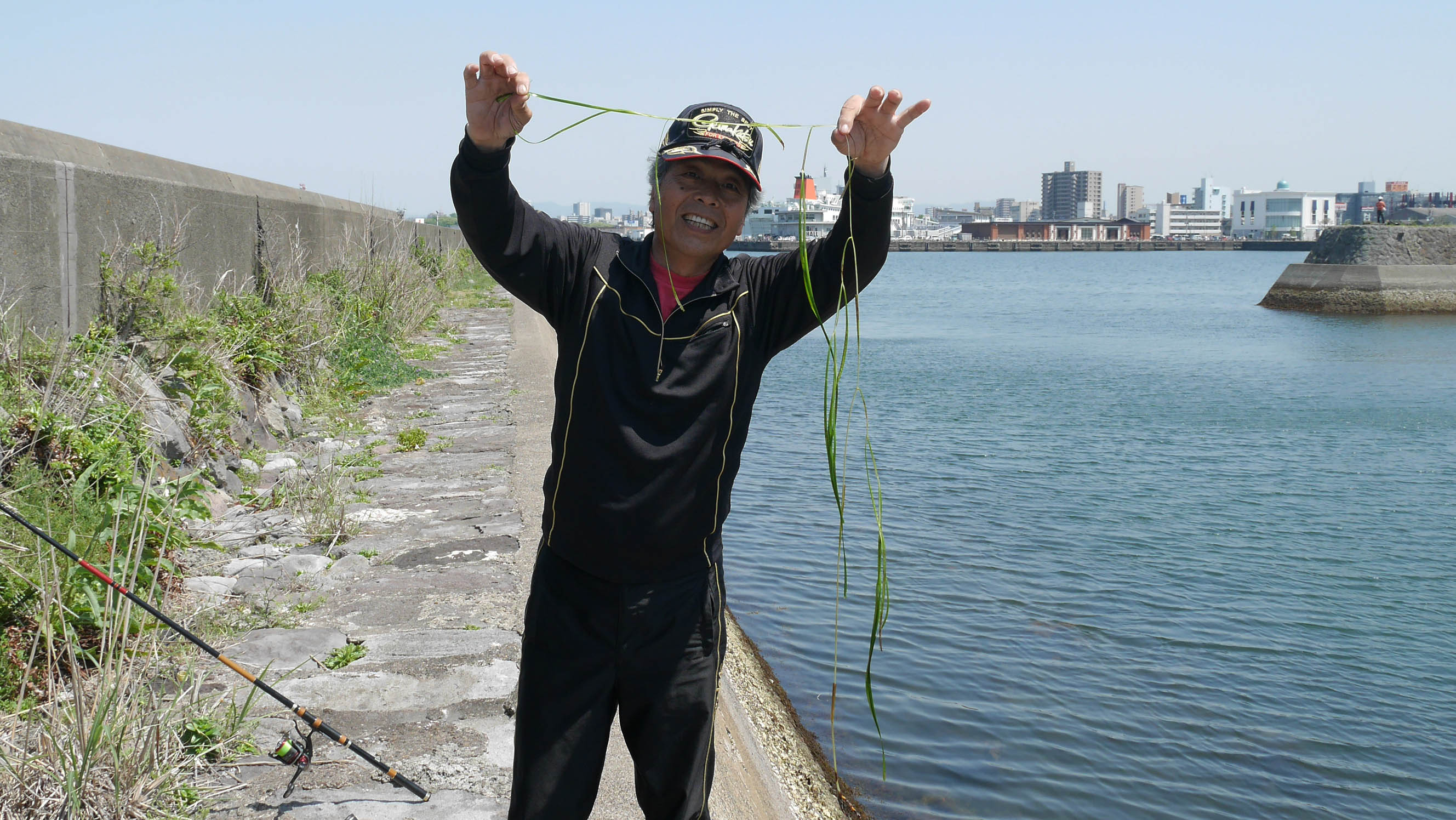 水深は大潮の満潮で3ヒロ強。干潮では2ヒロ有る無しの水深です。おまけにニラみたいなネギみたいな海草が、かなりの密度で茂っています。釣れた海藻は数知れず、長さは30㎝~1m以上までで、海底の砂地が出ている所は非常に少ない状態でした。