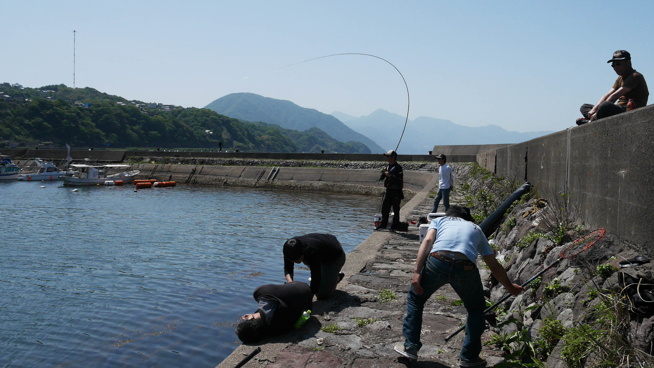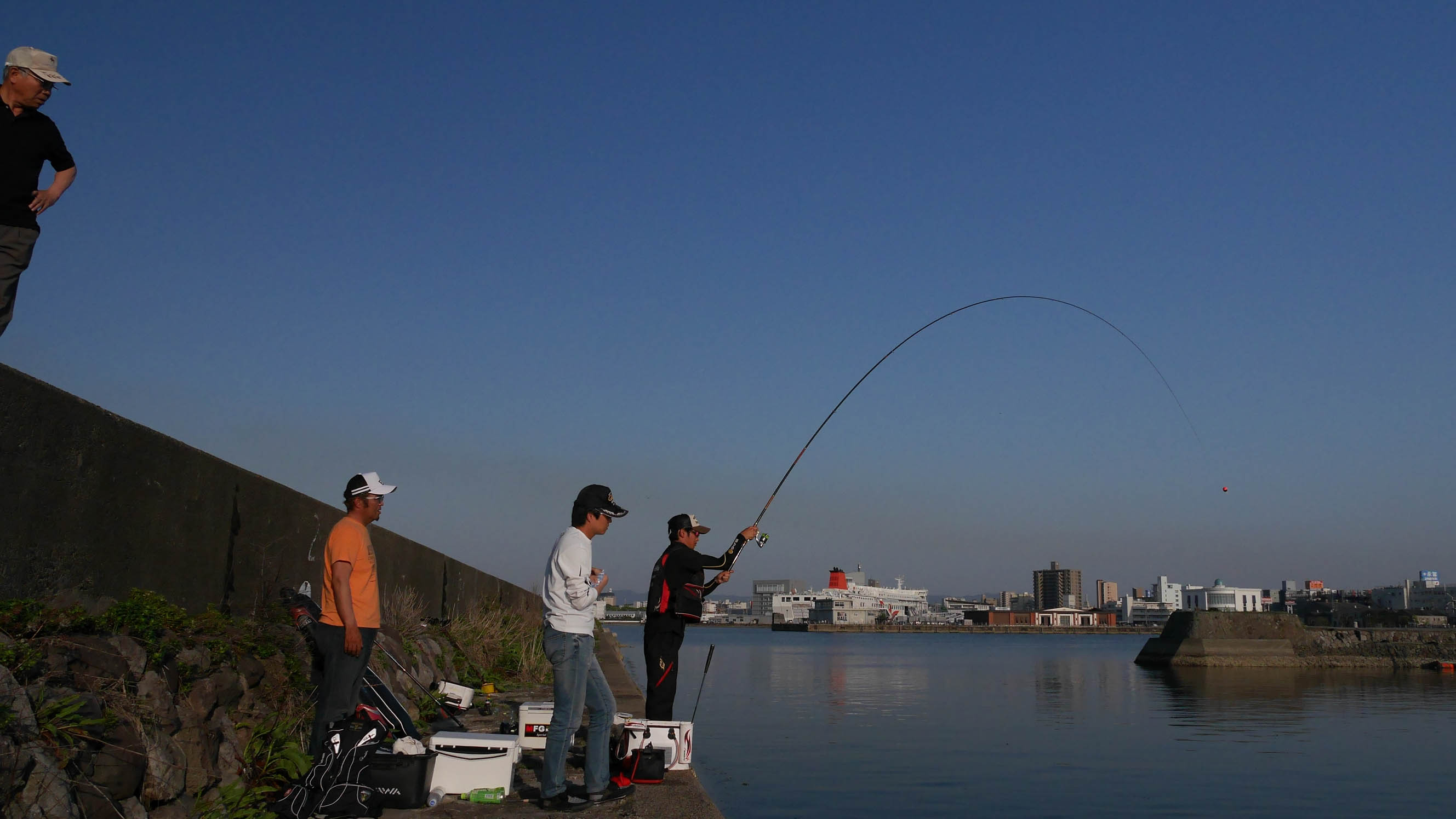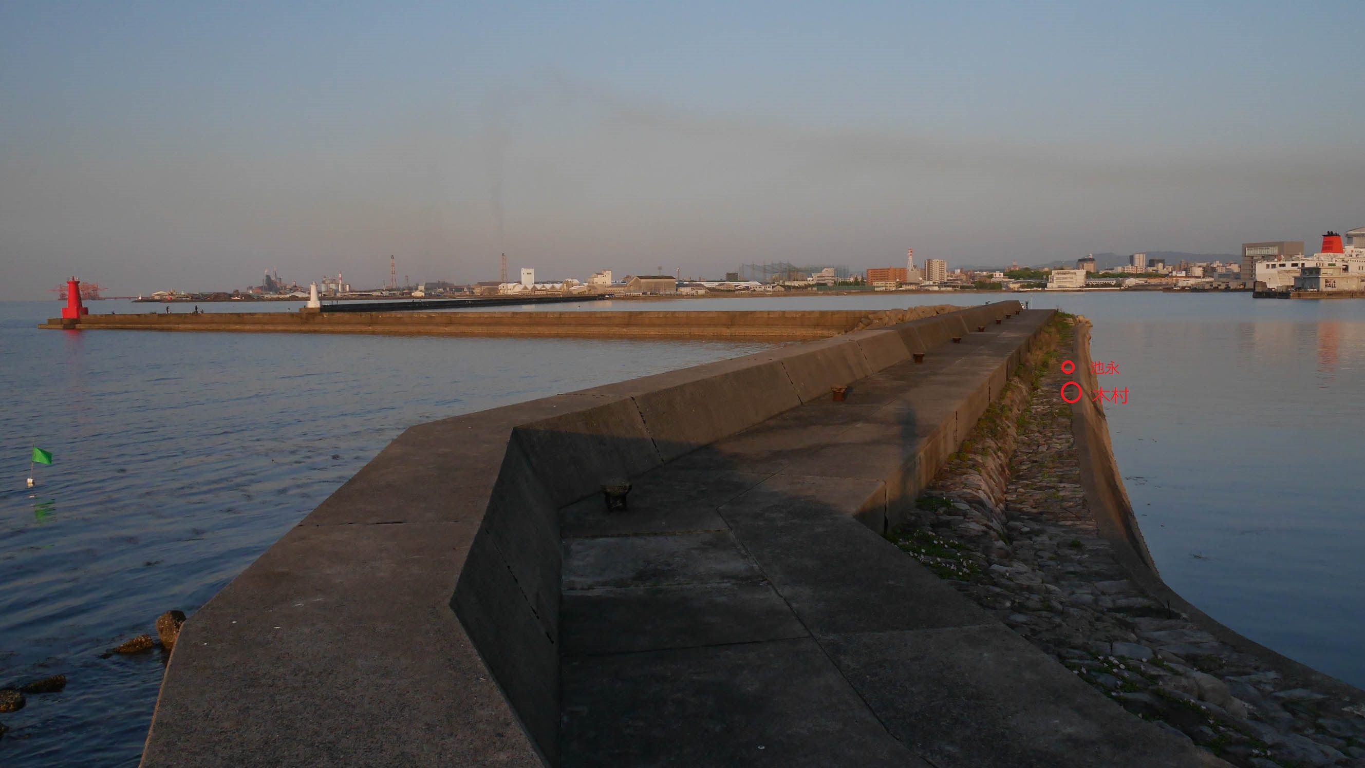 GW期間中の大分市内の防波堤や岸壁はかなりの釣り人。北から北東の風が思ったよりも強いので、西大分港の赤灯台に行く途中から、マリーナ大分を向いての釣りに決定。