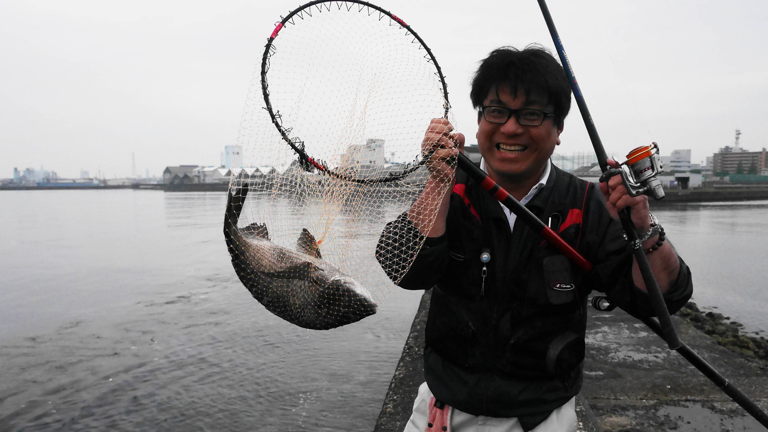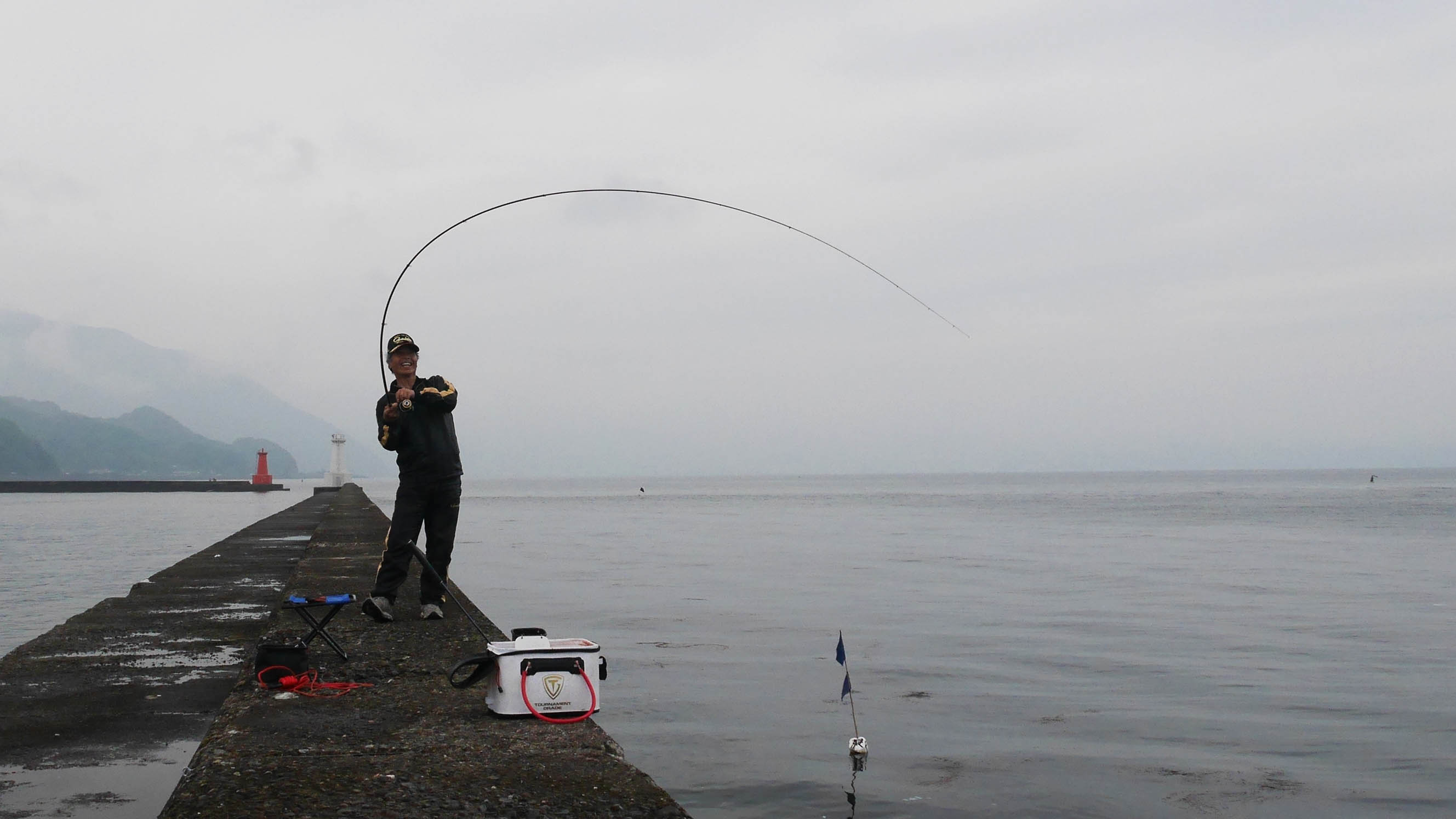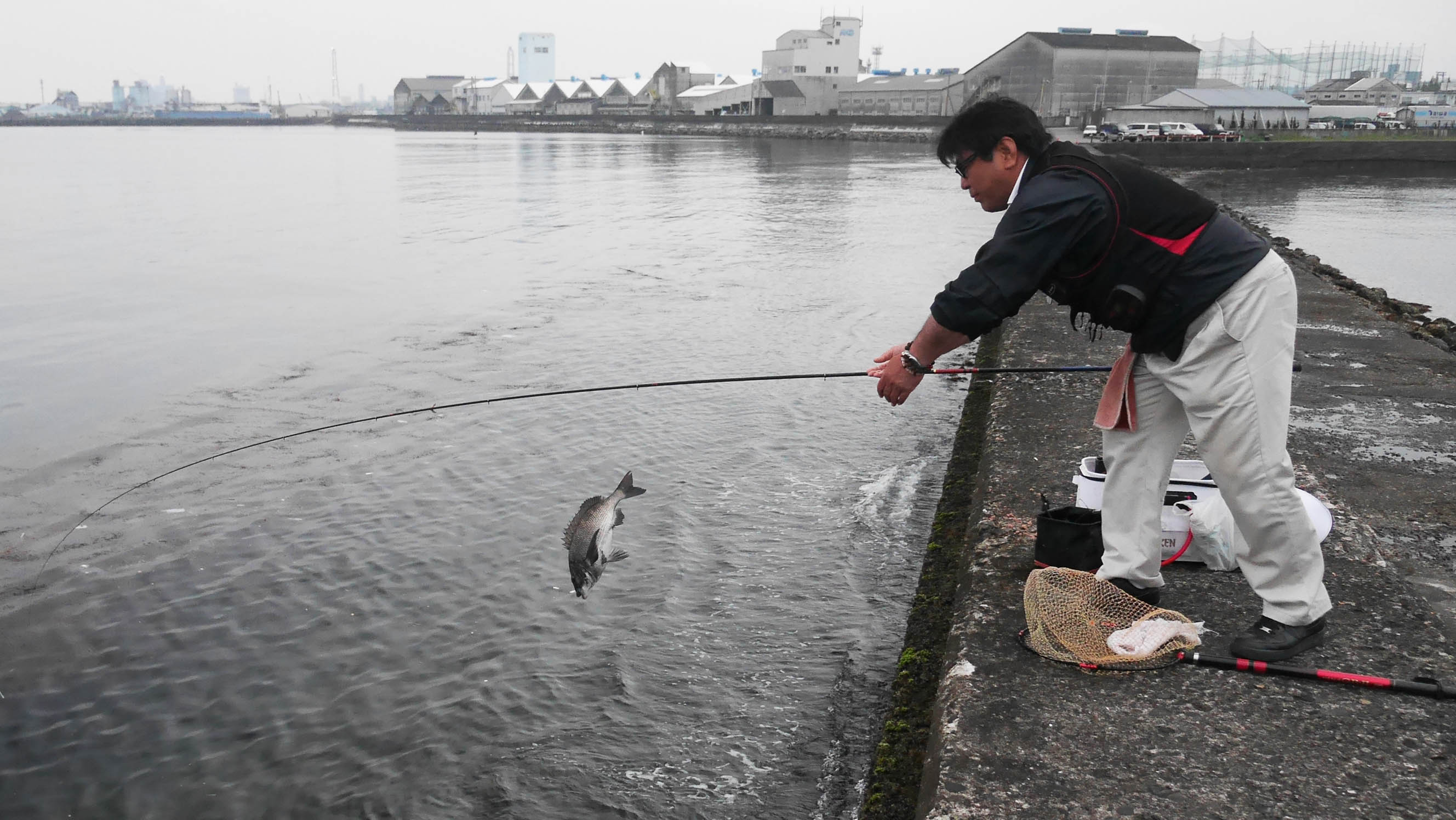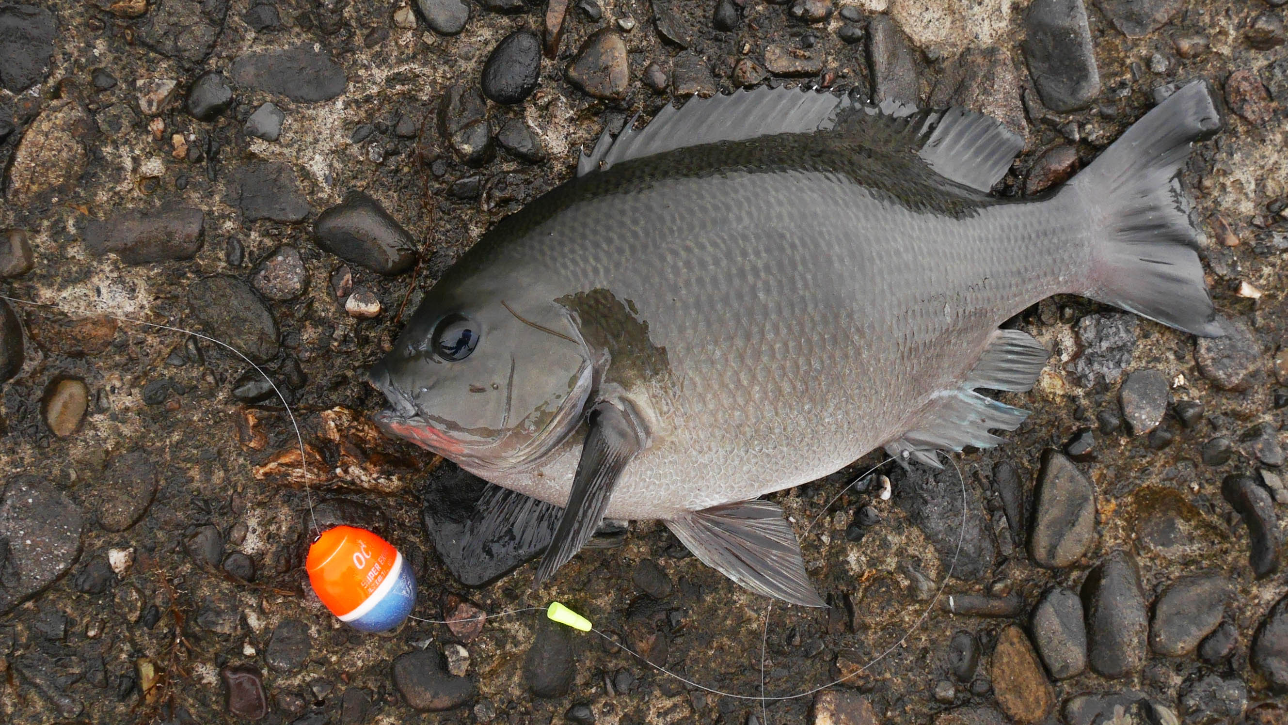 チヌ狙いは港の内側も外側も狙えますが、雨上がりの南西の風を利用できる港外のポイントを攻めてみました。10m沖までは海藻がびっしりありますが30mほどの遠投で釣っていると30㎝弱のグレ。しばらくするとまっさんが余ったマキエを持って横に入り・・・