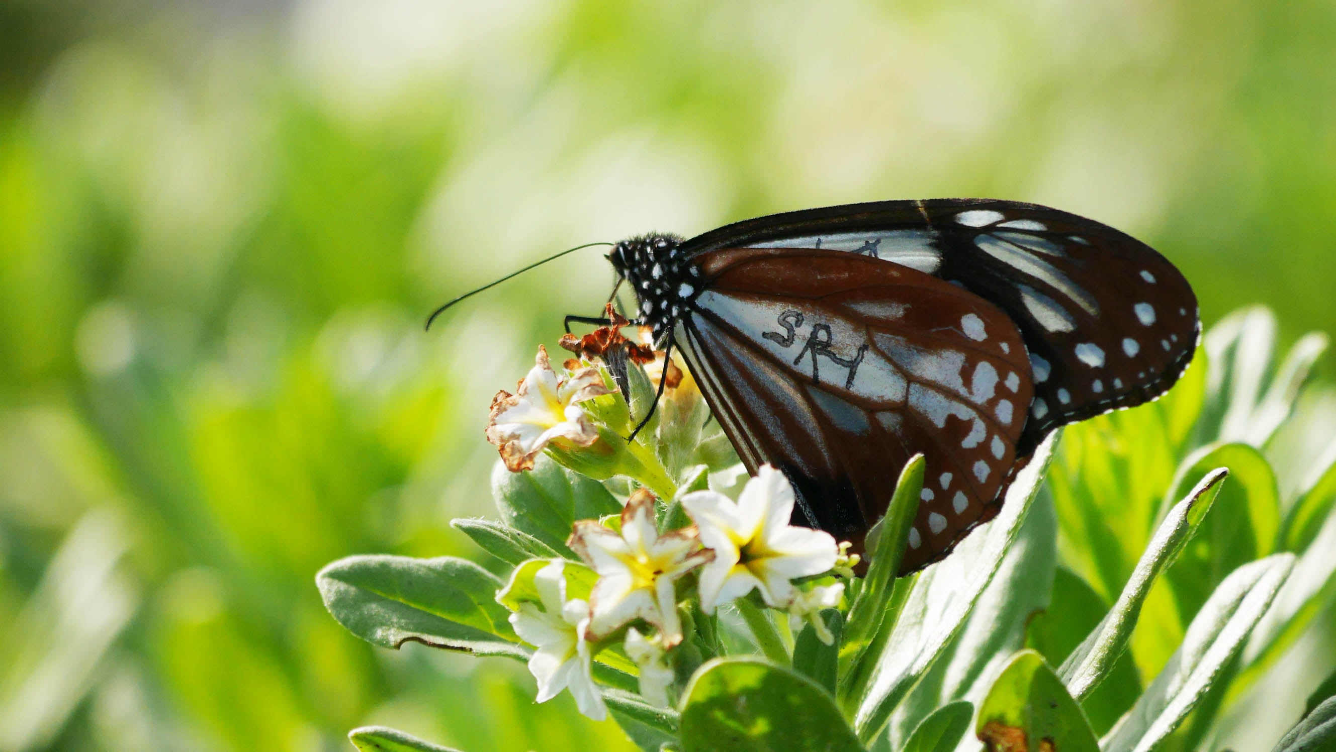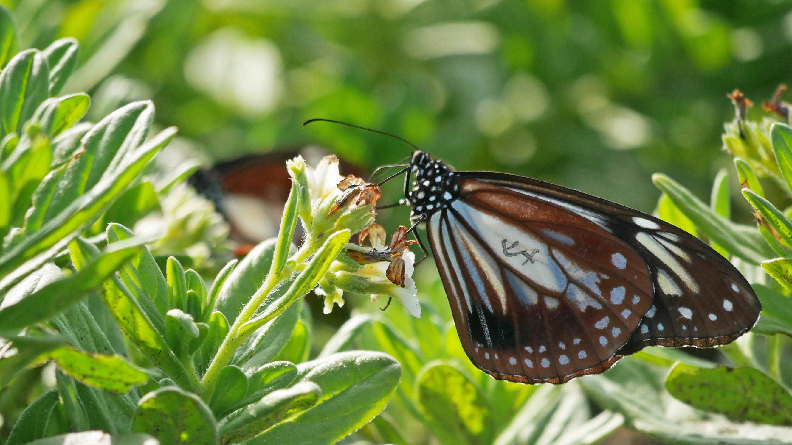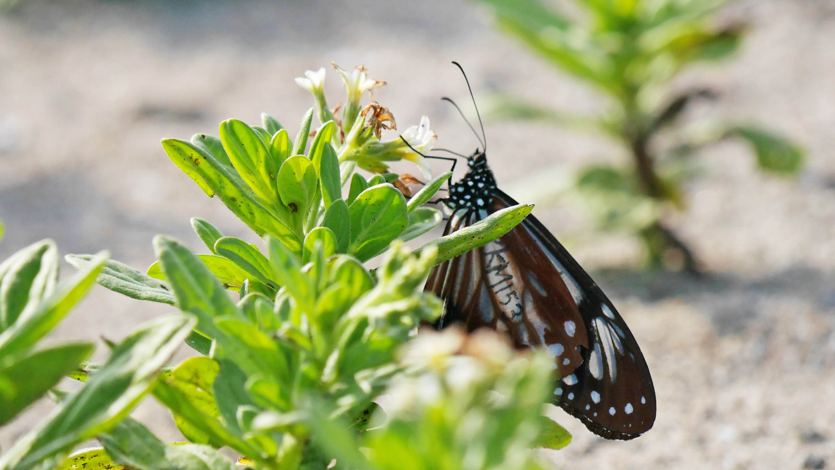 昨日の夕方に出現しているアサギマダラは50~60頭くらいと少な目。その少ない個体を良く見るとマーキングが施されています。アサギマダラは世界的にも有名な渡り蝶として1980年代に確認され、本格的に調査が始まったのは2000年以降なのです。
