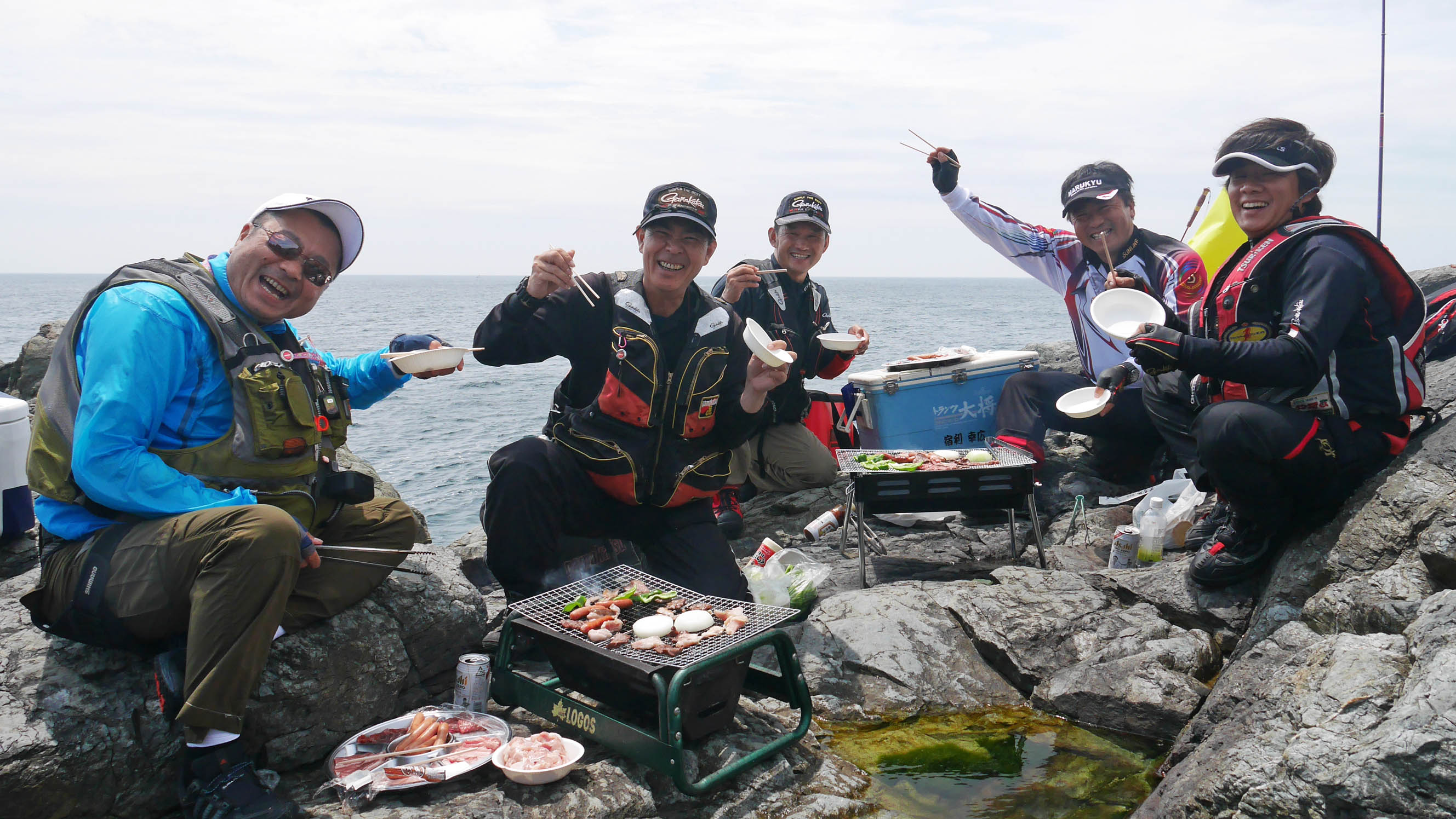 その後は6名でトーナメント方式のグレ釣りです。一ヶ所の竿出し時間は40分。6名だから240分の釣りで25㎝以上のグレ3匹検量の試合です。4試合目まで下げ潮での釣り、昼食の焼肉を楽しく食べて、午後からの2試合は本命の満ち潮狙い。