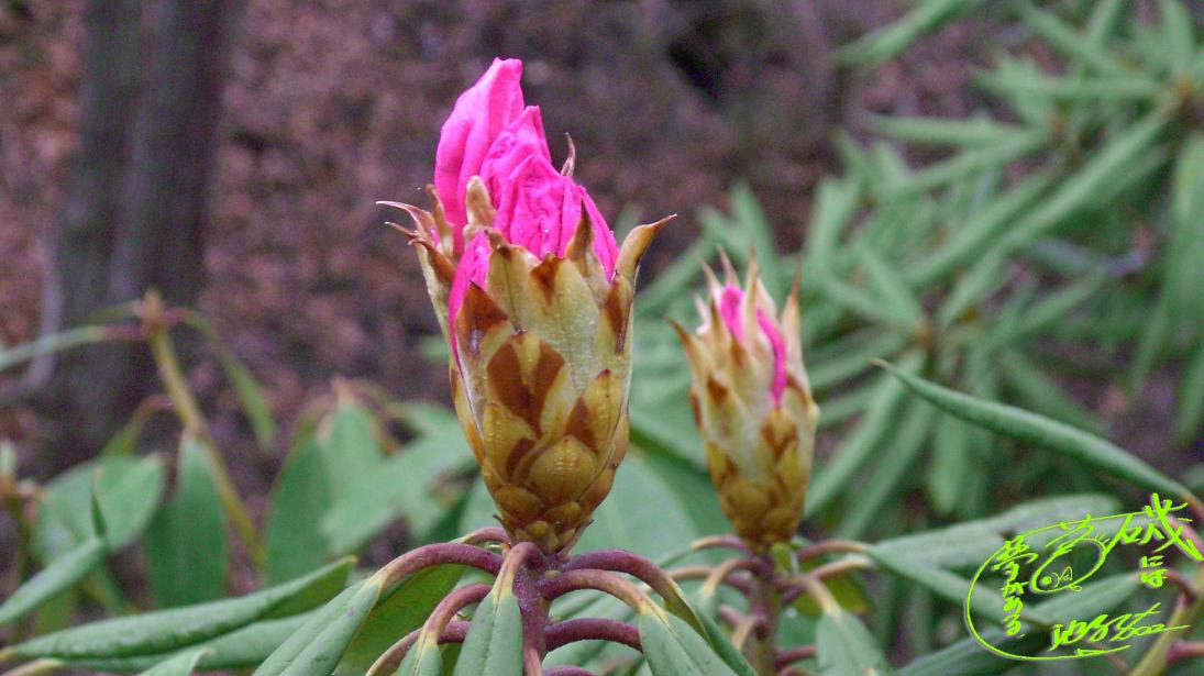 シャクナゲは未だつぼみが堅く、一輪だけ花が開いていた。この株だけは絵の様なつぼみが生長している。一度に咲いたらどれだけ綺麗だろう。