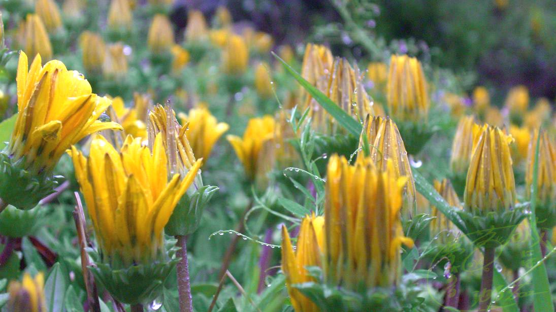 この花は野生化したガザニアと思う。空き地に群生しており、今にも咲きそうな感じだった。カラスノエンドウに光る雨しずくも美しい。