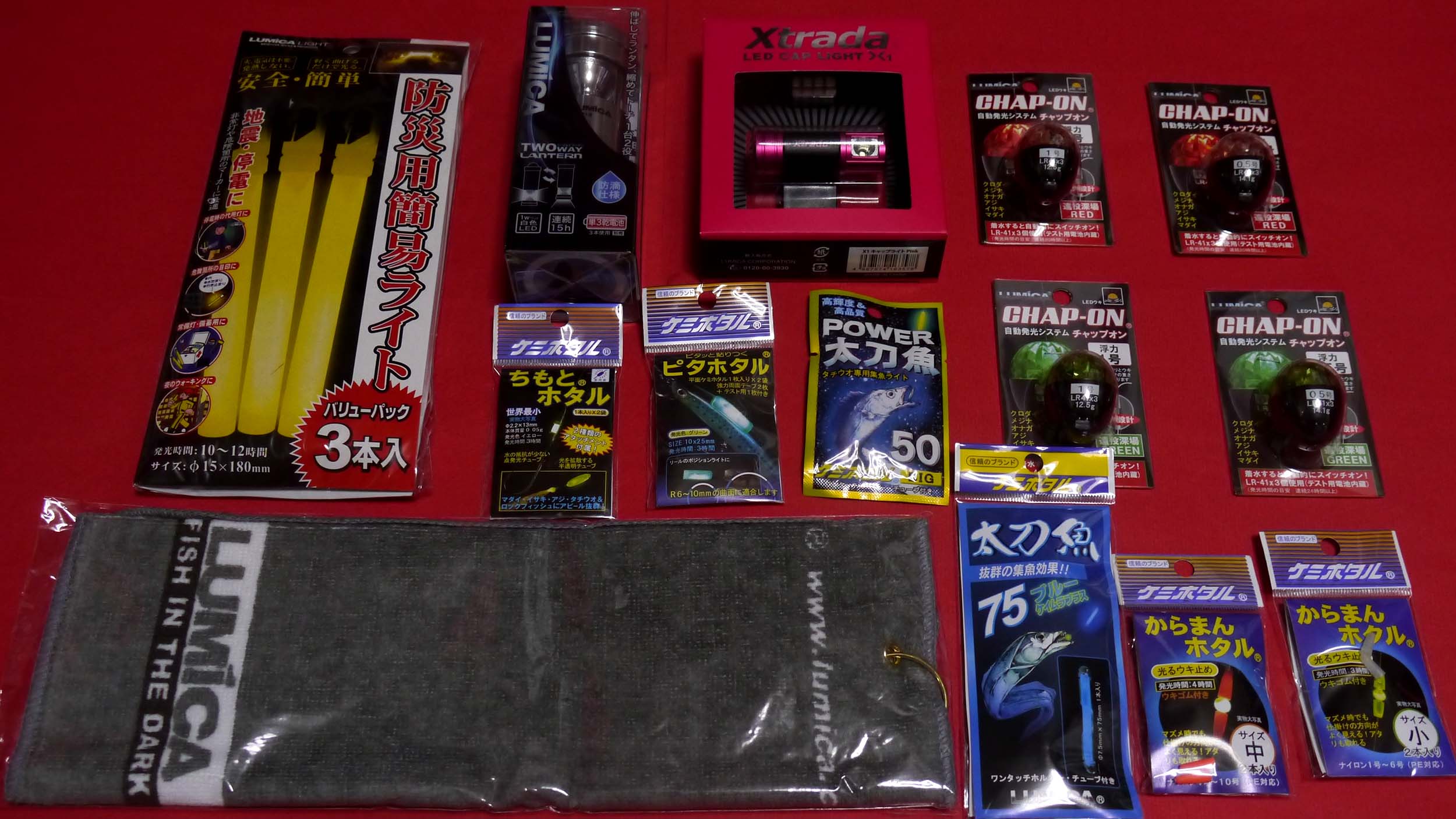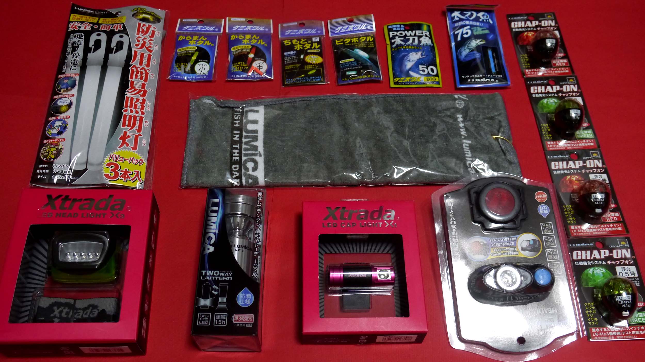 釣研は40㎝のトーナメントバッカン・ルミカはランタン・キャップライト・チャップオン・ハンドタオル・防災マーカー・ケミホタルなどのセットです。