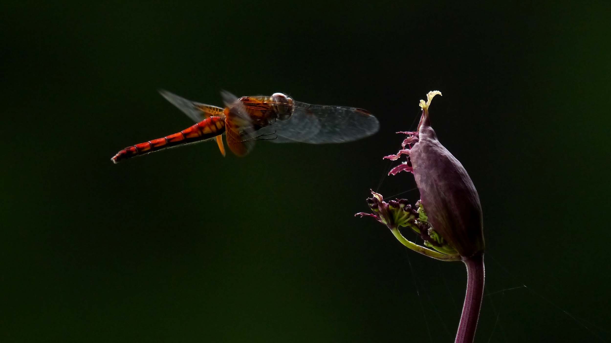 このトンボは止まってくれるので写しやすいけど、少し上の山で見たオニヤンマは、飛び交いながら小型の羽虫を狙うので、なかなか写せません。