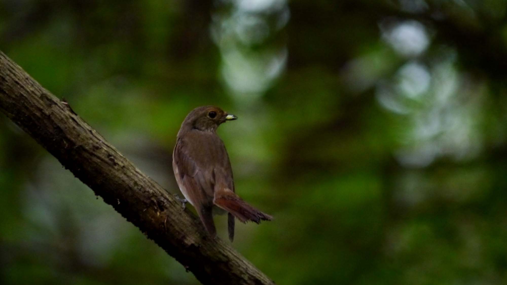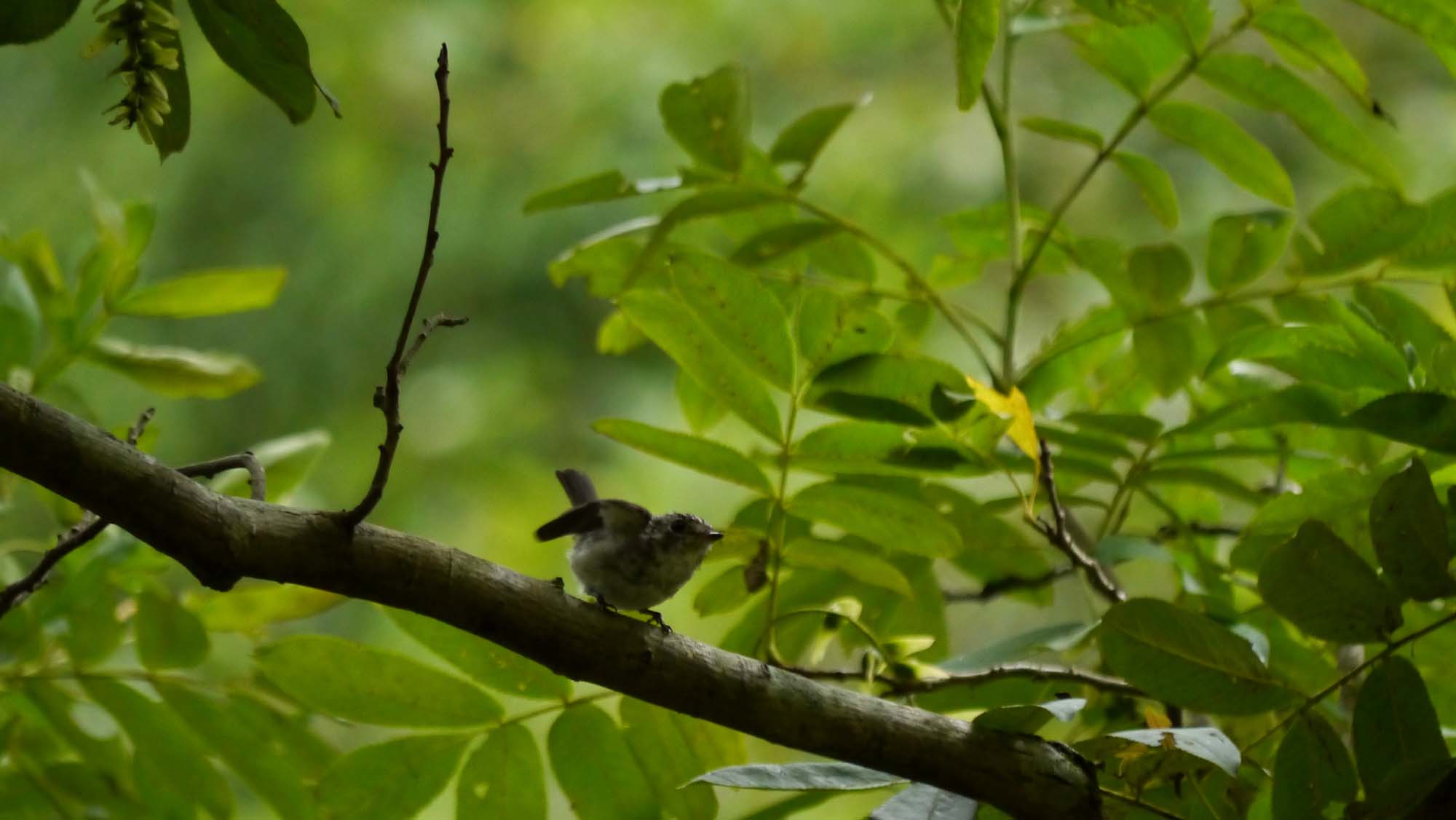 サワグルミの大木に一羽の小鳥、コサメビタキの若の様。
