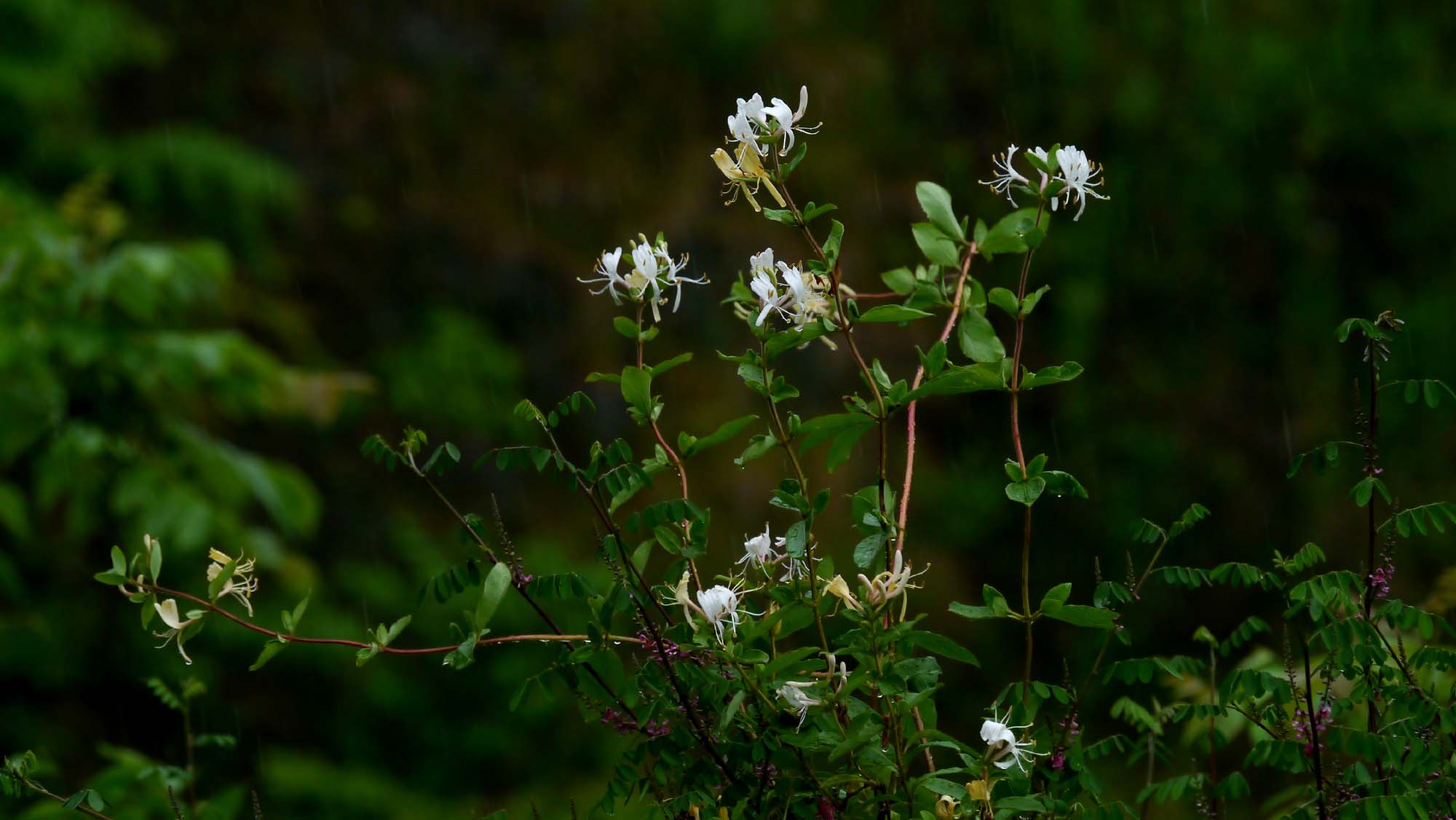 梅雨の山で白と黄色の花を咲かせています。