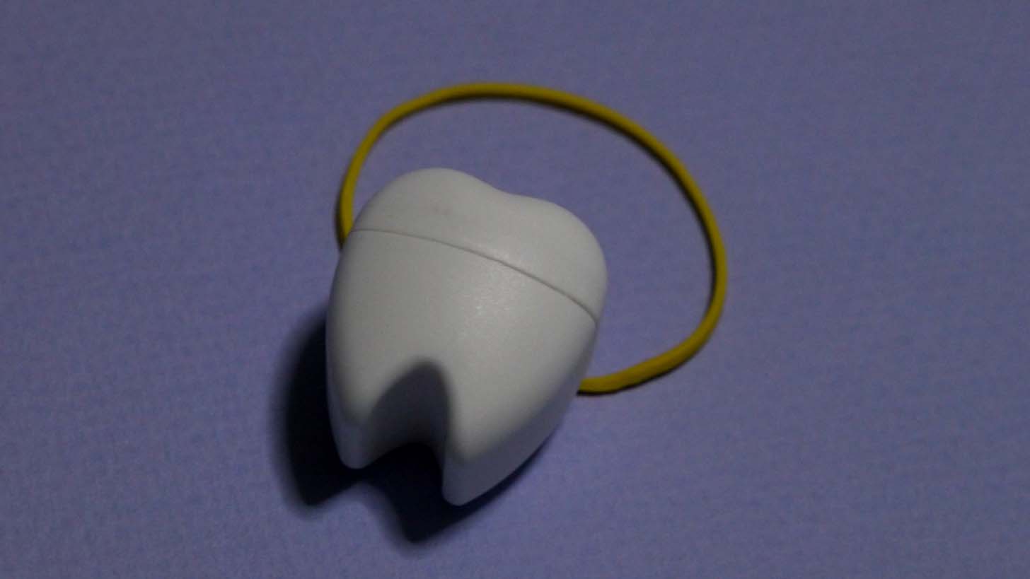 歯の形をした入れ物に、抜いた歯が入っています。