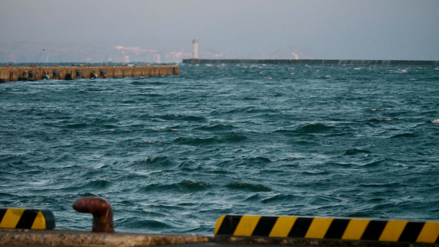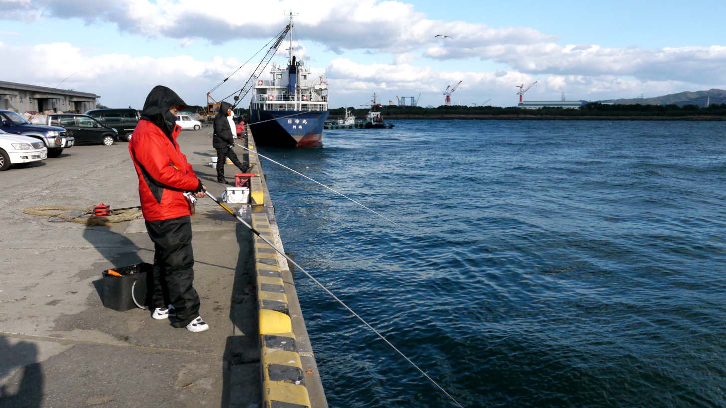 初心者コースは防波堤からのチヌ釣り。北西風を避けてポイントに選んだのは、大在公共埠頭の通称“砂置き場”。水深は6m前後と比較的浅場です。