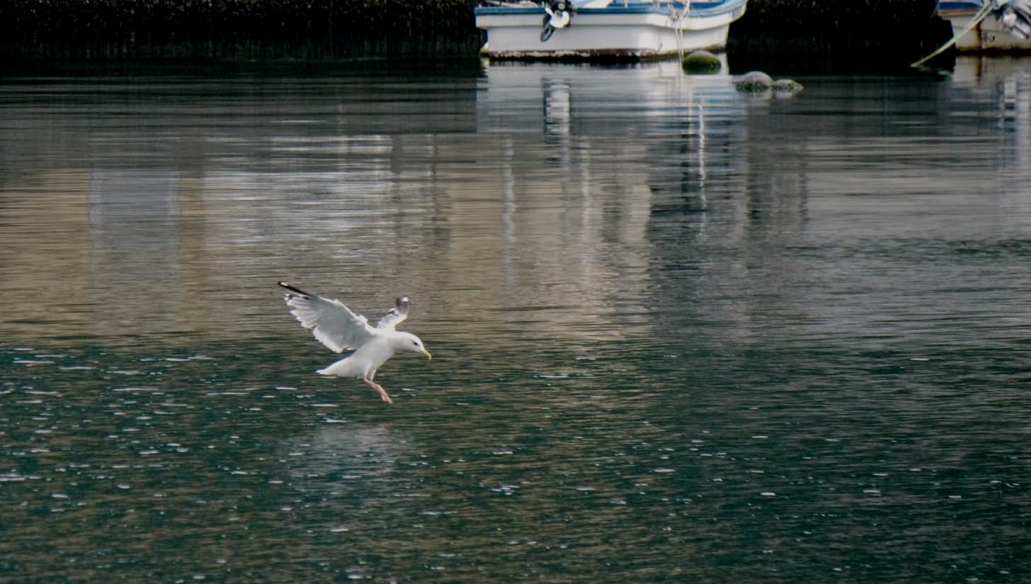 ウミネコが多い中で一羽のカモメ、オオセグロカモメかな?