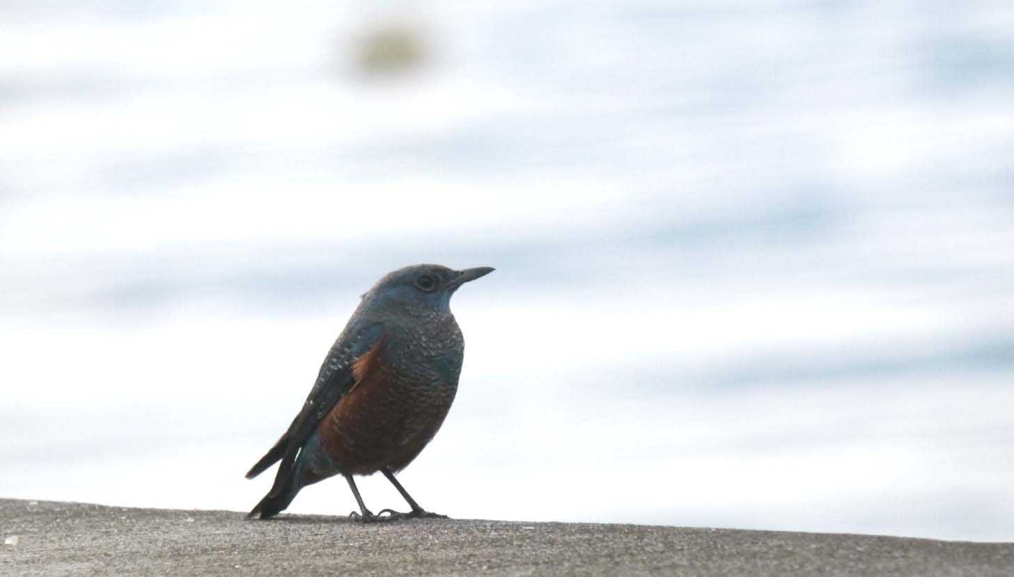 港の入り口にある防波堤、一羽のイソヒヨドリのオスが来ていました