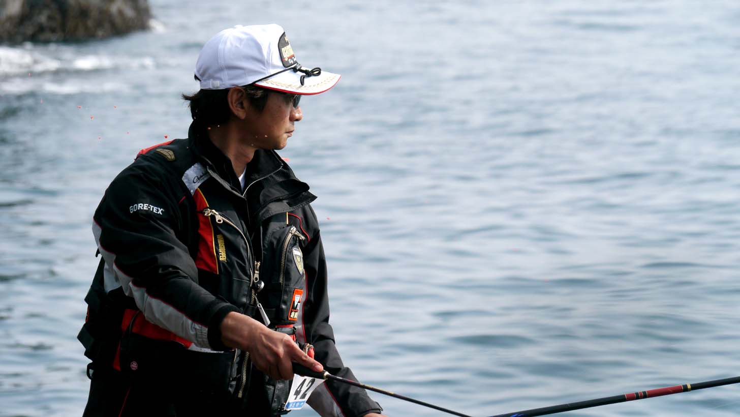 前半に満ち潮の潮上に入った猪熊選手、開始早々に30cm未満のグレ、しばらくしてキープサイズを取り込みました。審査員が安堵するのはこの瞬間で、決勝戦の競技が成立した1枚なのです。