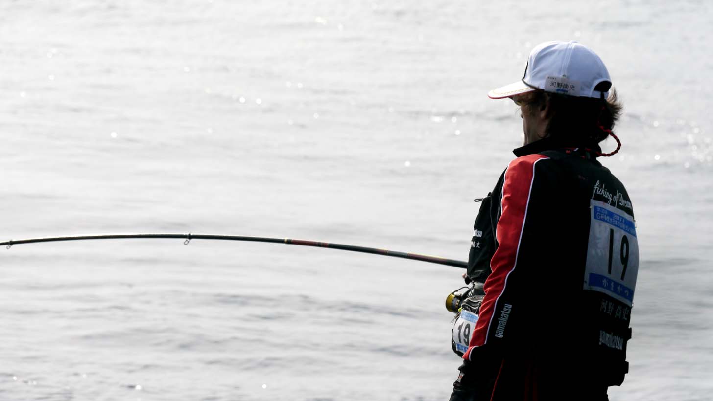 試合は終始猪熊選手のリードで、後半戦に入ります。潮はかなり満ちており、後から右の足場に入った河野選手、足元のサラシが大きくなって、手前での仕掛けなじみが不利な状況。