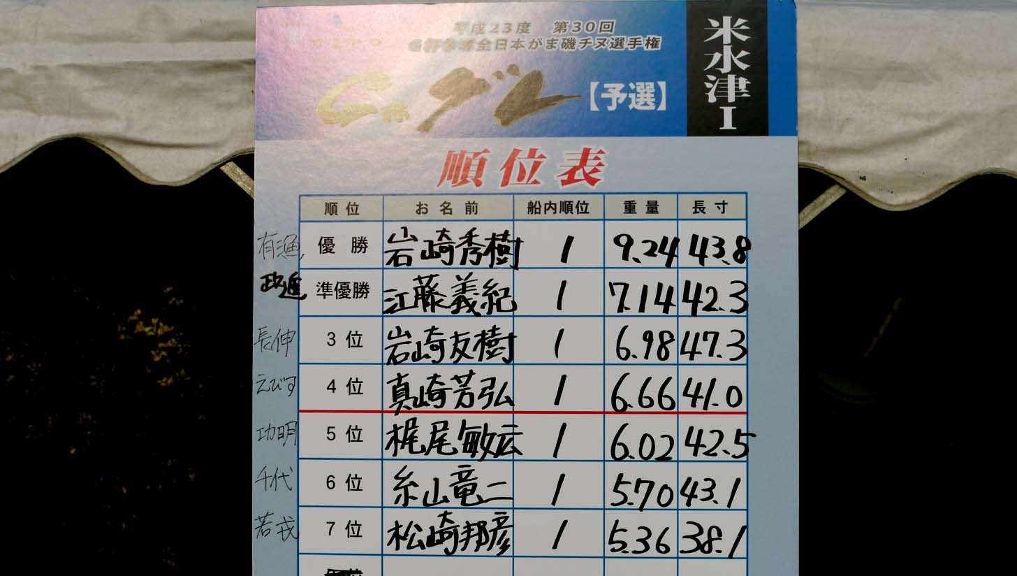 沖縄からサッシーが単身来県、27日のG杯九州予選に出場しました。偶然にも私が担当する政進丸に乗船、上がった磯は横島7番。この磯は予備的な場所ですが、仕方ありません。25cm以上のグレ10匹までの検量でしたが、サッシーの釣果は8枚ほど。残念ながら上位進出は叶いませんでしたが、健闘してくれました。
