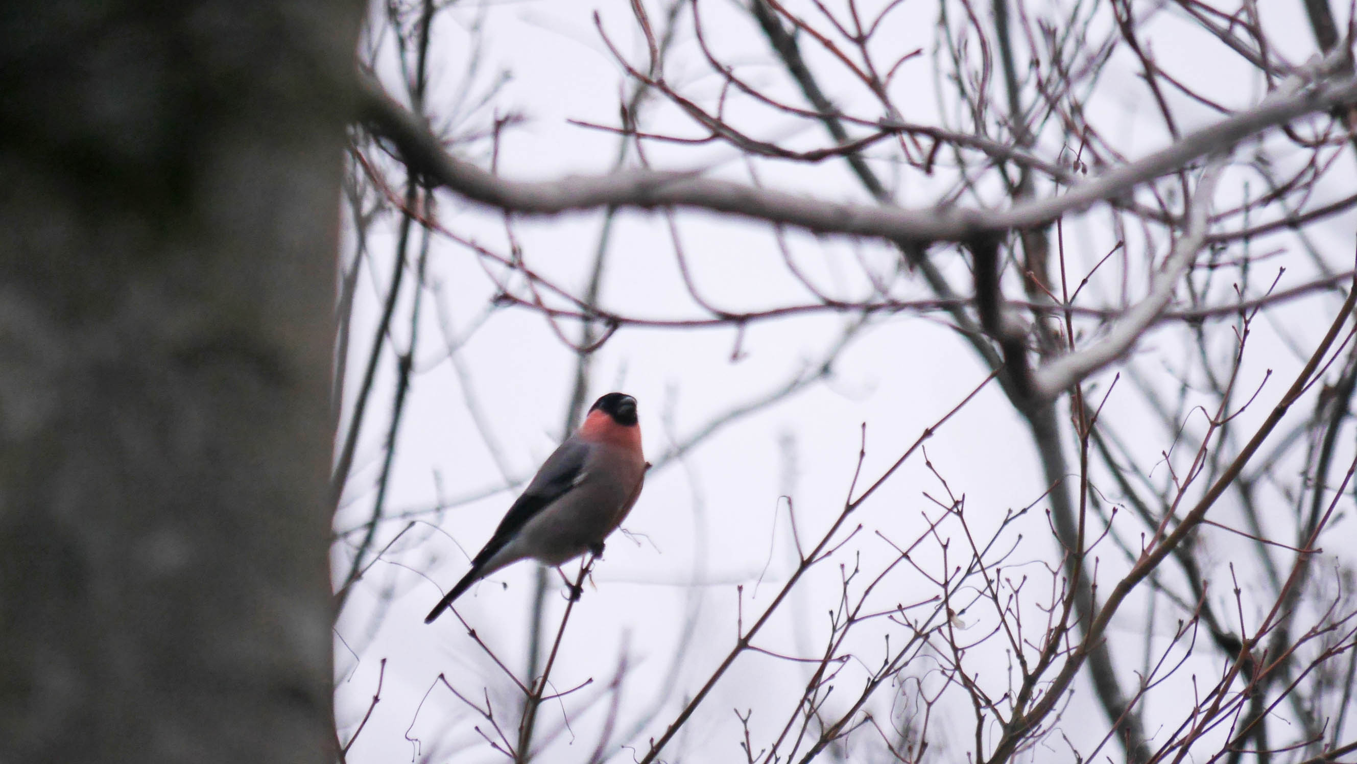 まったりと眺めていると黒っぽい鳥が幹に止まりました。