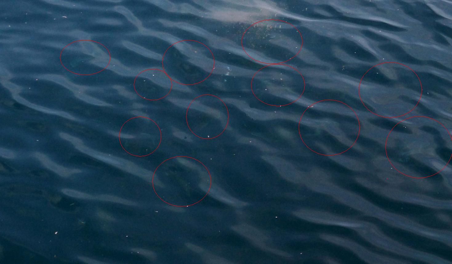 マキエが効いてくると、40m沖から30m沖、更には20m~10m先にもシマアジが姿を見せ始めます。マキエに浮いてくるシマアジは50cm前後が多く、水面直下に20~30匹くらいは見えるのです。
