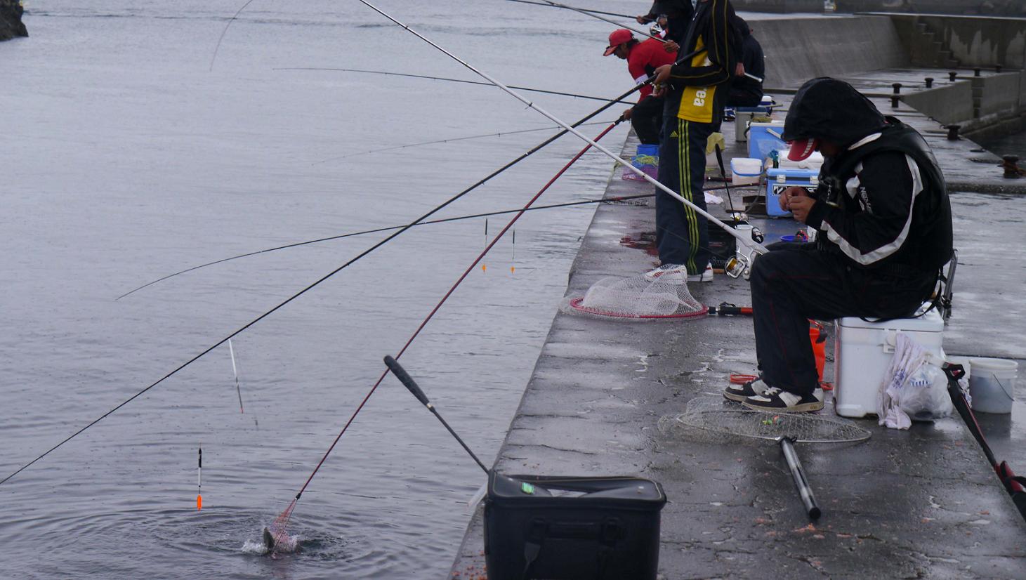 釣り方は大きく分けて二通りあり、遠投ダンゴ釣りとフカセ釣りです。良く釣れるのは遠投ダンゴ釣りの方で、竿は3~4号クラス・移動ウキ・ハリスは4~6号・ピンポン玉大のダンゴを二つ付けて、40~50m沖を狙っています。