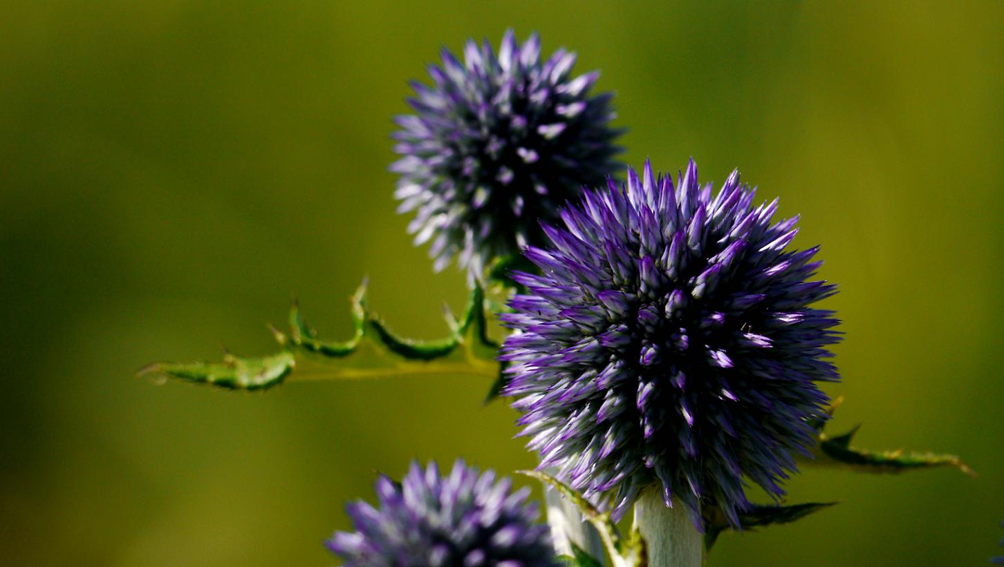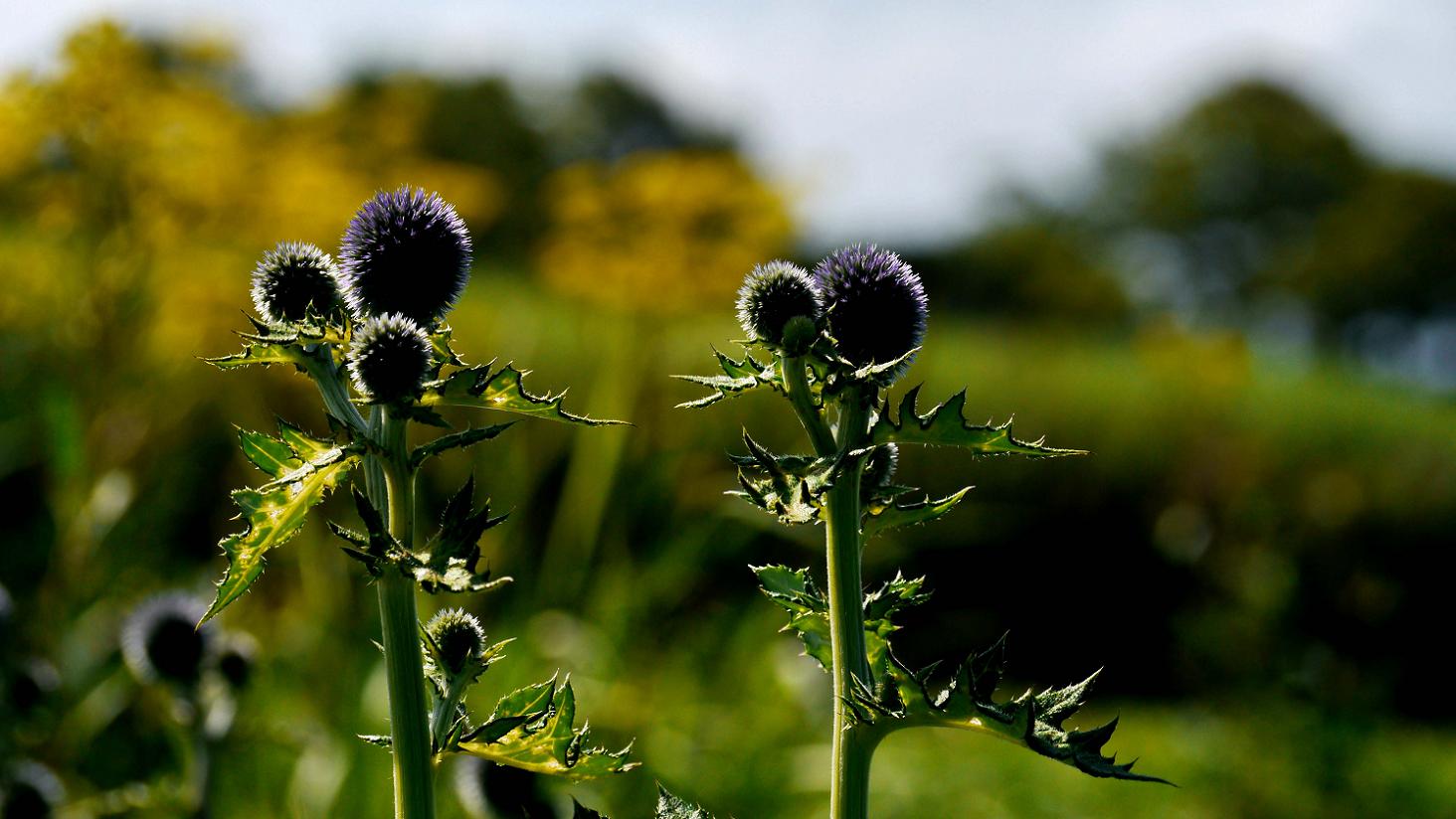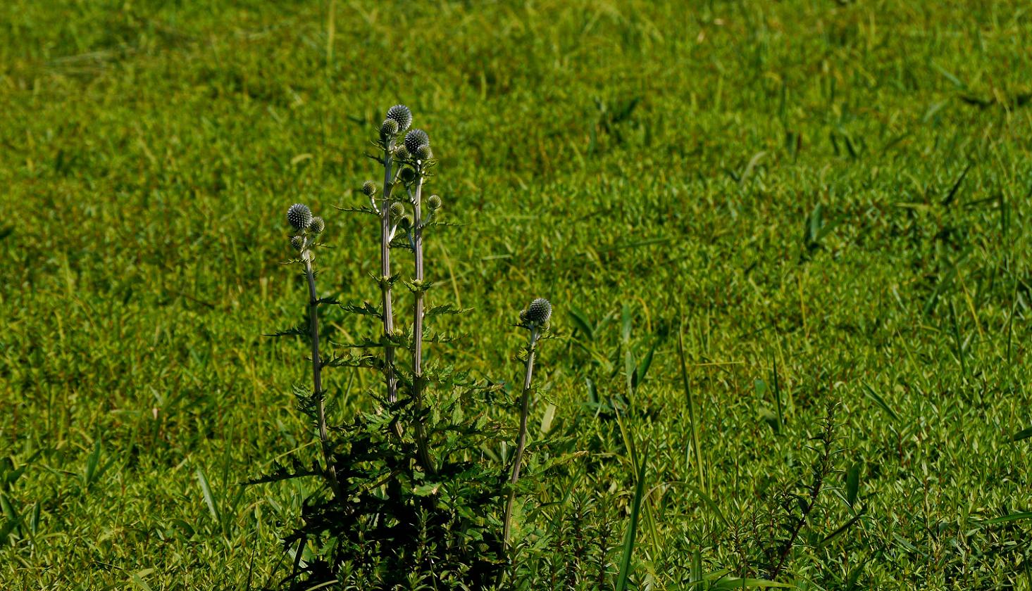 ヒゴタイは5万本ほど植えられていて、丸い坊主頭を着けています。でも花には色が付いていないので、まだ蕾?5万分の2株ほど瑠璃色の花になっており、見ごろは8月中旬から下旬ではないかと思いました。